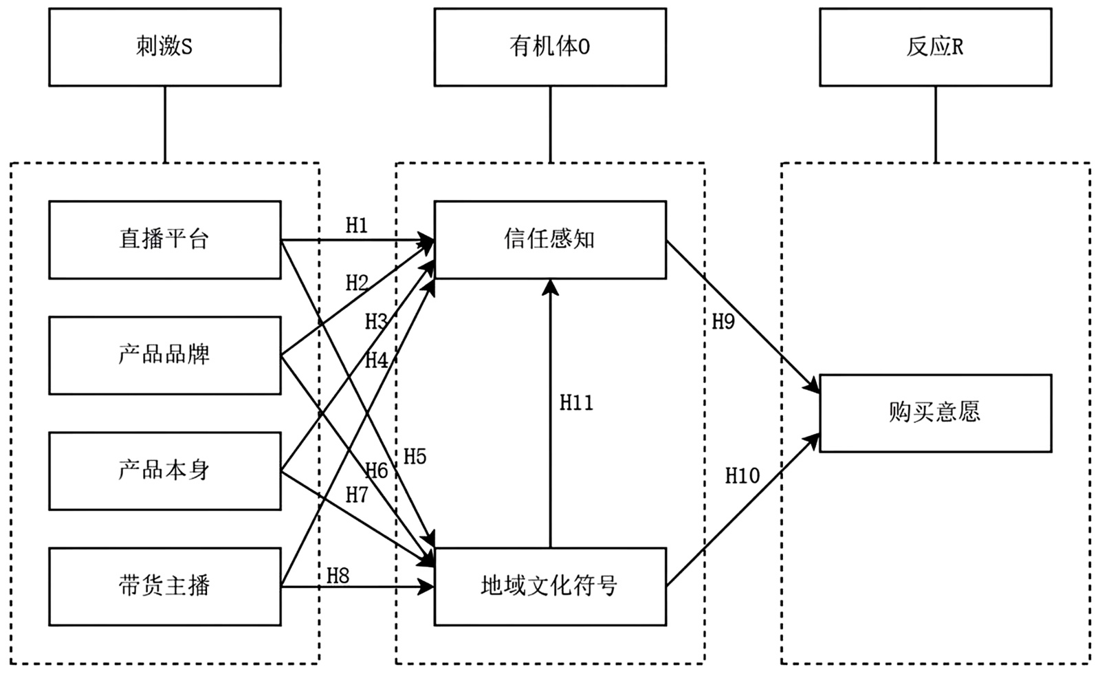 地域文化符号与特定地理区域紧密相连,在农产品营销中具有独特价值。研究表明,其能有效降低消费者感知风险并提升产品评价。特殊的地域文化符号自身就是特有文化历史和特殊文化象征意义的完美融合[7]。在直播中,地域文化符号的呈现更为直观生动。现有研究虽关注“区域形象”“文化认同”对购买意愿的影响,但多将其作为独立变量,少有研究系统地将地域文化感知作为S-O-R模型中的核心“有机体”变量,并探讨其与消费者信任的交互机制。