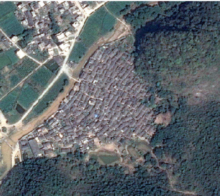 数据是2022年12月高景一号影像,全色分辨率优于0.5米,多光谱分辨率优于2米,全色波段为450~700纳米,试验区实际面积为215842.68平方米。研究区域为湖南省江永县夏层铺镇上甘棠村[9],位于江永县城西南25km,东南与江华瑶族自治县接壤,南与广西富川瑶族自治县相连,西南与广西恭城瑶族自治县交界,西北与广西灌阳县毗邻,北部紧靠道县。江永县属南岭山脉的山地丘陵区,中部地势相对平坦,山间多个盆地之间相互连接,地形是喀斯特地貌,整个县的气候类型是亚热带季风气候。上甘棠村位于此地已经有上千年历史,现有居民453户,自宋代之前就有人定居于上甘棠村,世代繁衍至今,该村是湖南省目前发现的年代最为久远的千年古村,至今仍然保留200多幢古民居,上甘棠村民居大部分为晚清建筑,比较有代表性的建筑有弘治年间的门楼和万历年间的文昌阁。村内有雌雄二水,形似一幅“八卦图”,背倚屏脉山峰,可以说是依山傍水,这样的村落是典型湘南建筑的代表,该村是目前为止湖南省发现最为久远的千年古村落,上甘棠村在2006年被国务院认定为第六批全国重点文物保护单位,2007年它还被国家文物局和国家建设局评选为全国第三批中国历史文化名村。