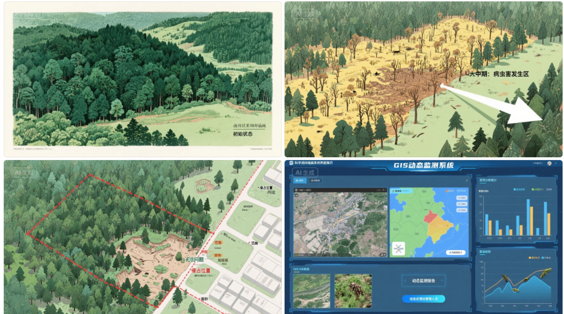 林政资源会随着林木的生长情况、病虫害的发生状况以及林地遭受侵占等情况而持续发生变化。将GIS技术同遥感手段相结合,便能够达成动态监测的目的。通过定期去获取遥感影像,与GIS系统所储存的历史数据展开对比分析,如此便能够及时察觉到林地植被的覆盖状况以及边界出现的变动等情况[3]。要是碰上林地遭受非法侵占的情形,GIS能够凭借其空间分析功能,利用先进的卫星遥感技术来精准地分析并确定垃圾堆放的具体位置、所占范围以及面积大小,然后把获取到的相关信息及时反馈给相关的管理人员。该技术还能够对监测所得到的数据展开细致的统计与分析,进而生成有关的动态监测报告,以此为制定针对资源的保护措施提供依据(图1)。