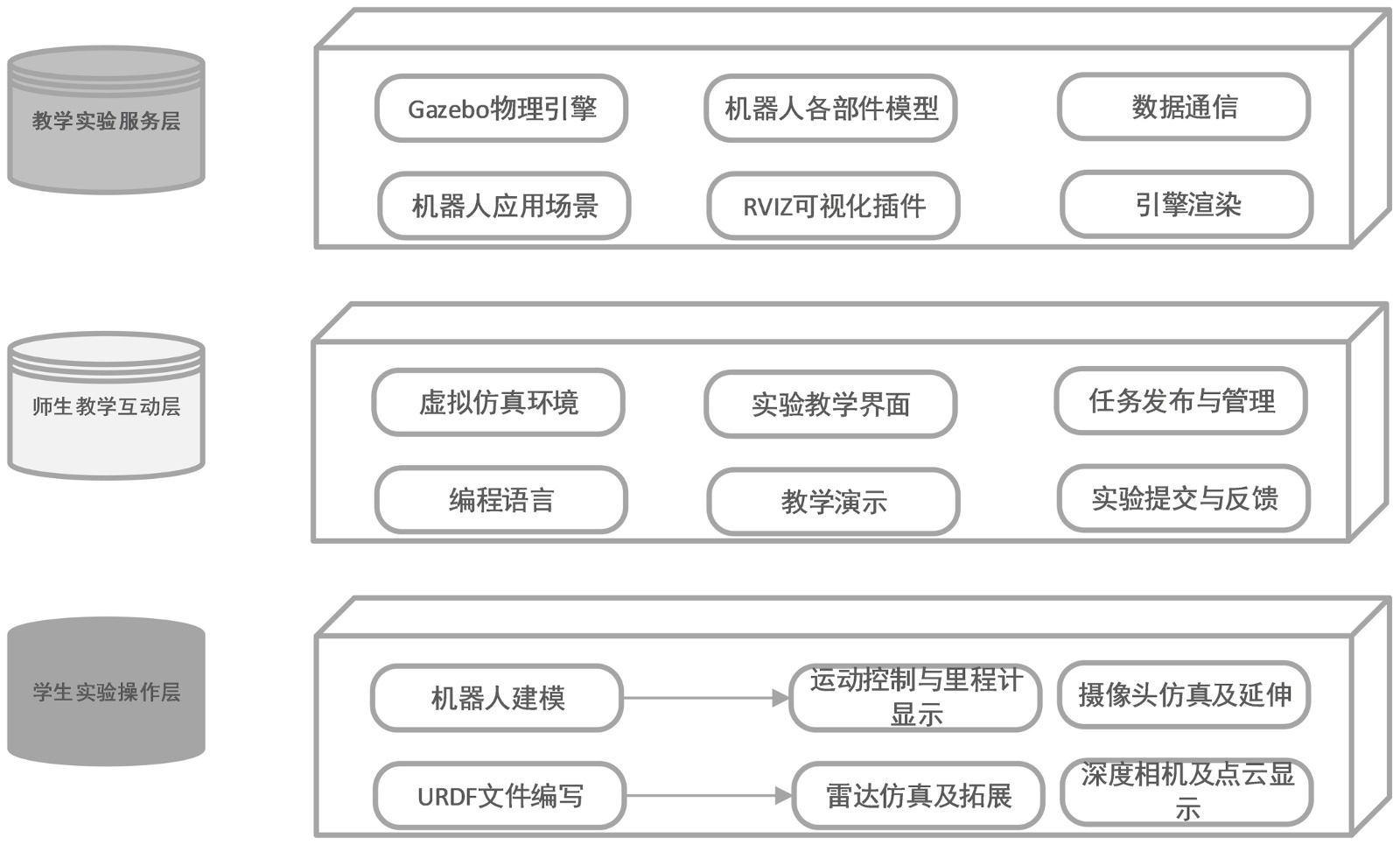 为了解决传统机器人实验教学中硬件受限、成本高、机会少等问题[8]。同时,也方便师生进行实践教学,提高课程效率,我们设计并搭建了一个基于ROS基本框架的智能机器人教学平台,该平台整合了ROS、Gazebo等仿真环境以及一些自研的教学模块,在减少学生编程工作的前提下,高效完成小车模型建立、控制小车模型运动、实现小车模型雷达、摄像头、深度相机等传感器的使用等相关实验。该平台解决了教学内容更新慢,实验设备不足等限制的问题,脱离了时间与空间的约束,学生可以反复练习,深刻掌握智能机器人的相关知识,极大程度提高了学生的理论知识和动手实践能力,还可以自由发散思维,培养创新能力,为机器人教育领域提供一个创新的教学解决方案,促进了学生的全面发展。整体框架如图1所示。