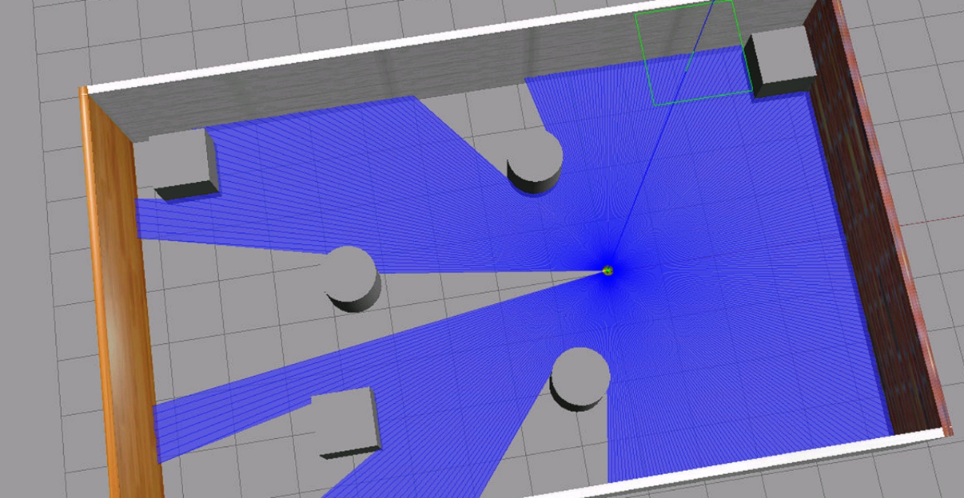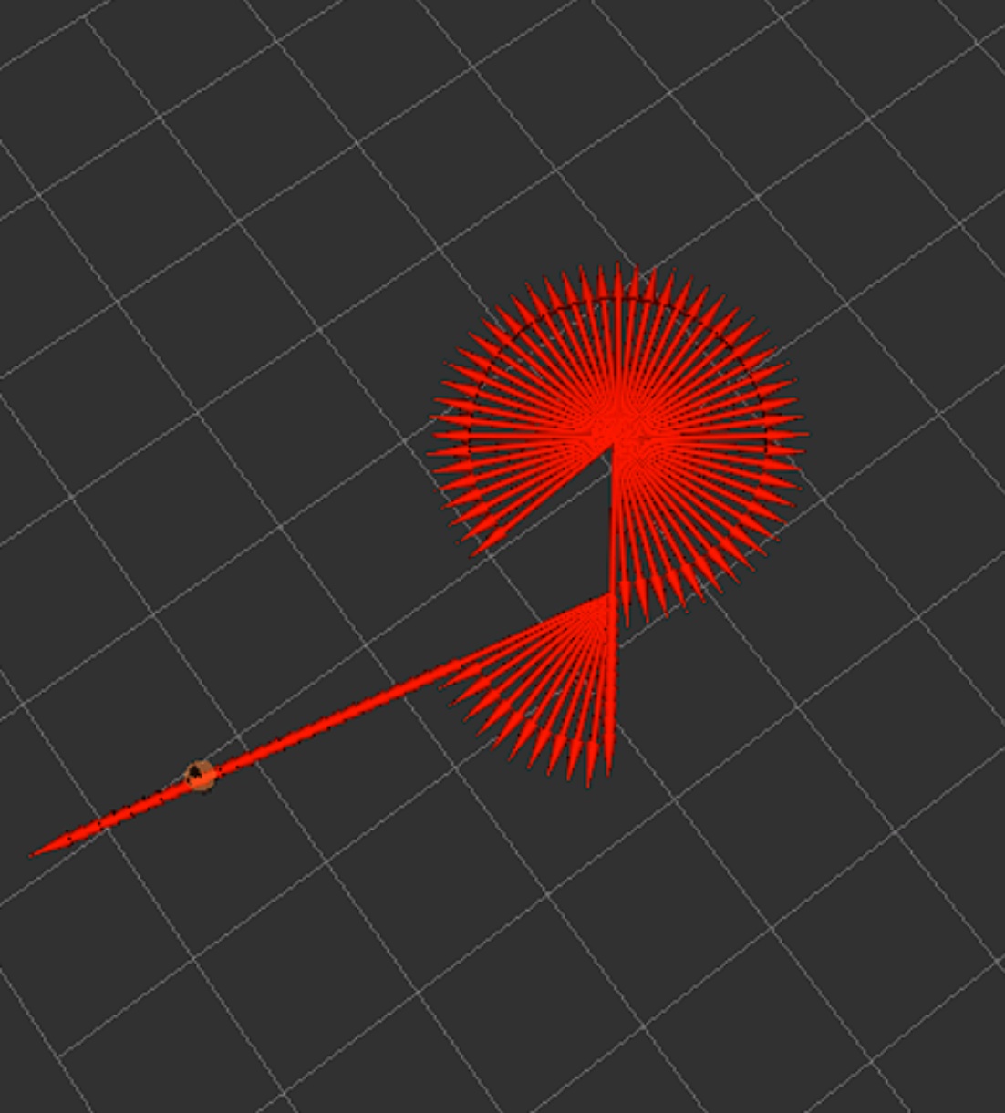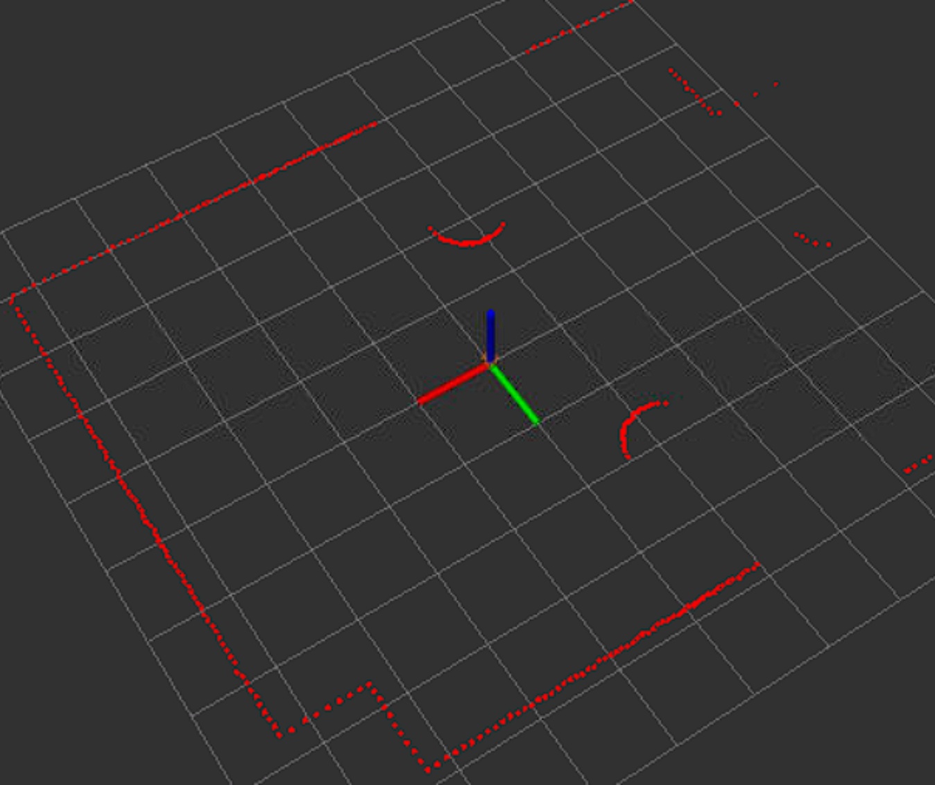 最终,学生可以在Rviz的可视化界面中,观察到激光雷达所“看到”的世界:环境信息被转化为由大量离散点构成的二维或三维轮廓图。这一从Gazebo中的“光束探测”到Rviz中的“轮廓再现”的完整数据流,清晰地揭示了从物理模拟到数据可视化的全过程。Gazebo中机器人发出的可视化雷达光束效果如图3所示,而在Rviz中显示的最终环境轮廓信息则如图4所示。