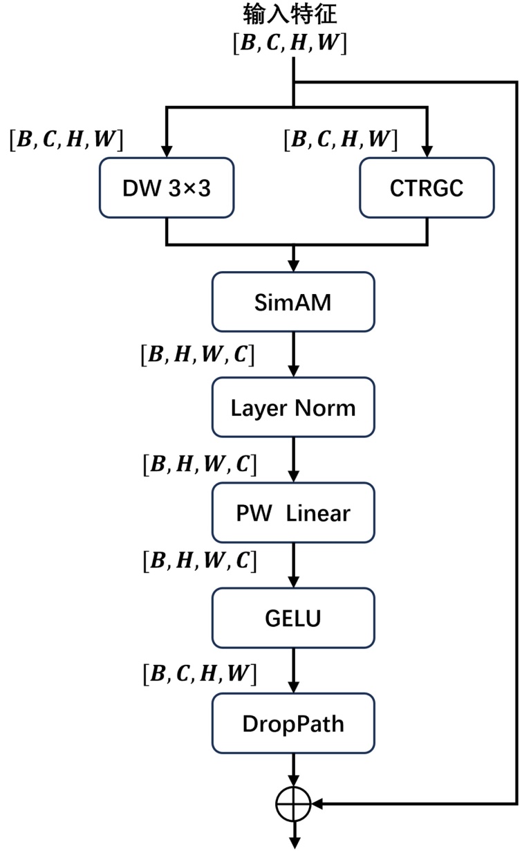 ,然后通过的并行双分支架构进行多层次特征提取,其中深度卷积分支利用3 × 3深度可分离卷积(DW)以参数高效的方式捕捉局部空间模式和细节特征,同时CTRGC图卷积分支通过将特征图重塑为图结构数据并应用通道–空间关系图卷积来建模全局上下文关系和长程依赖,这种双路并进的设计使得模块能够同时从局部细节和全局结构中汲取互补信息,随后两个分支的输出通过基于可学习权重的自适应融合机制进行智能整合,公式如下: