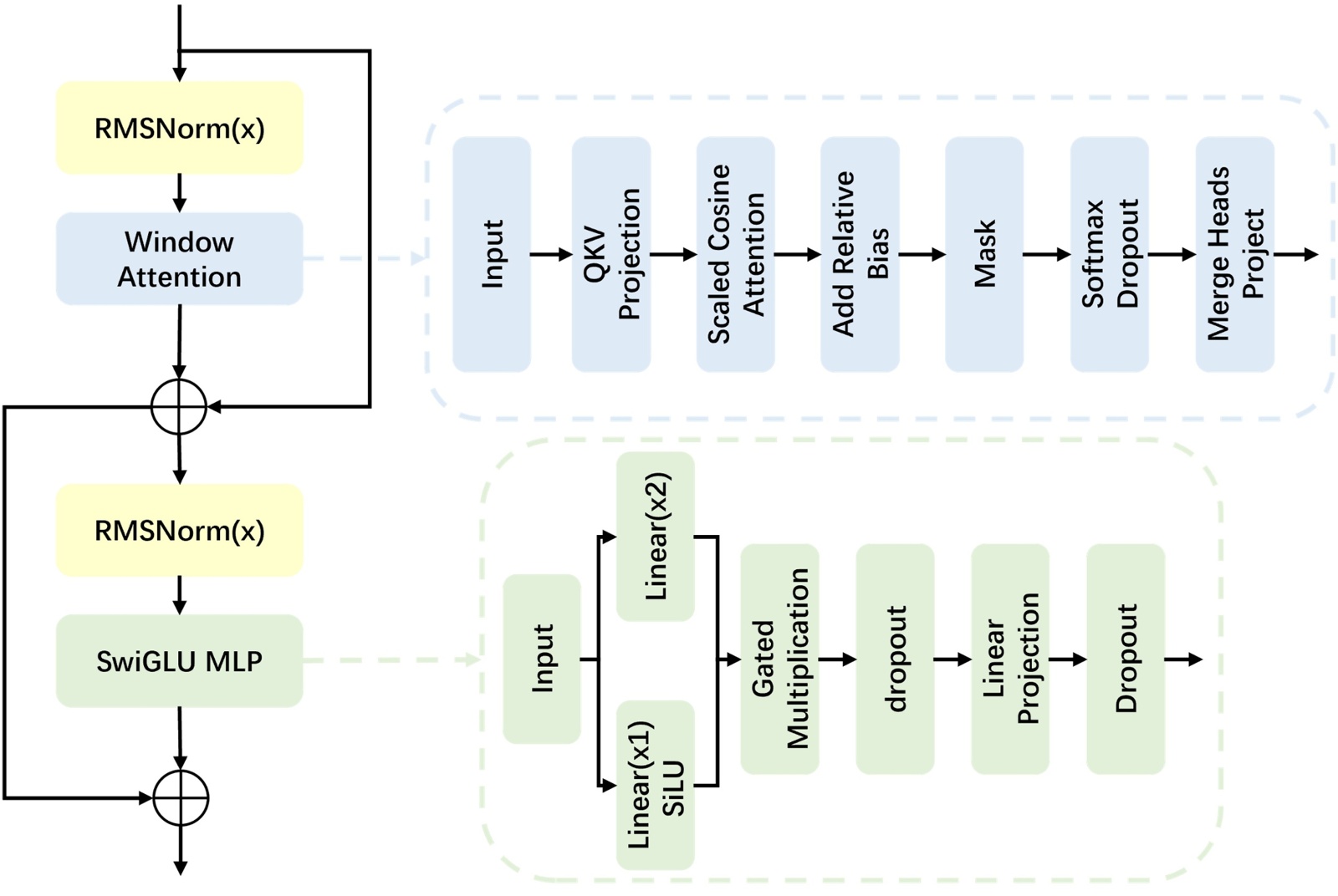 该结构通过双线性投影生成两个并行特征流并采用SiLU激活的门控相乘机制(Gated Multiplication)实现动态特征选择与融合,从而增强非线性表达能力;最终再次通过残差连接整合输出,整个模块融合了局部注意力建模与全局特征变换的优势,结合RMSNorm归一化、随机深度丢弃和移位窗口等技术,在保持卓越特征提取能力的同时确保了训练稳定性。