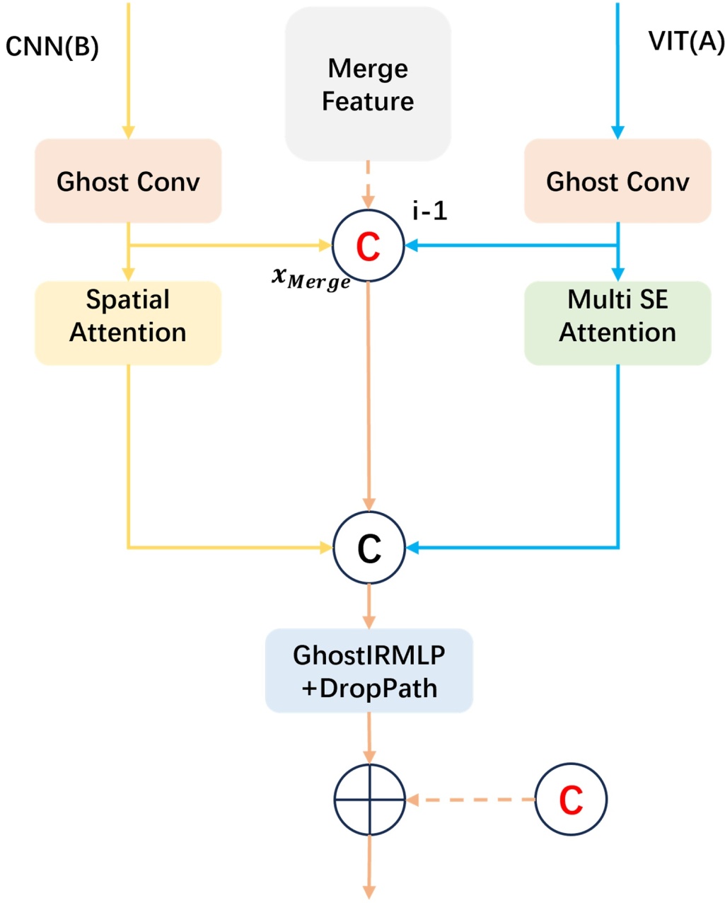 3. 在CNN与Transformer之间我们设计了特征融合模块(Feature Merge Block, MergeBlock),构建了多层次特征融合通路,通过高效多尺度通道注意力与轻量级空间注意力的协同作用,实现了跨模态特征的精细整合。该模块采用GhostConv [12]减少参数冗余,集成特征重校准机制动态调整各路径贡献权重,并通过GhostIRMLP结构强化特征变换能力。该设计显著提升了模型在复杂场景下数据稀缺时的性能衰减问题。