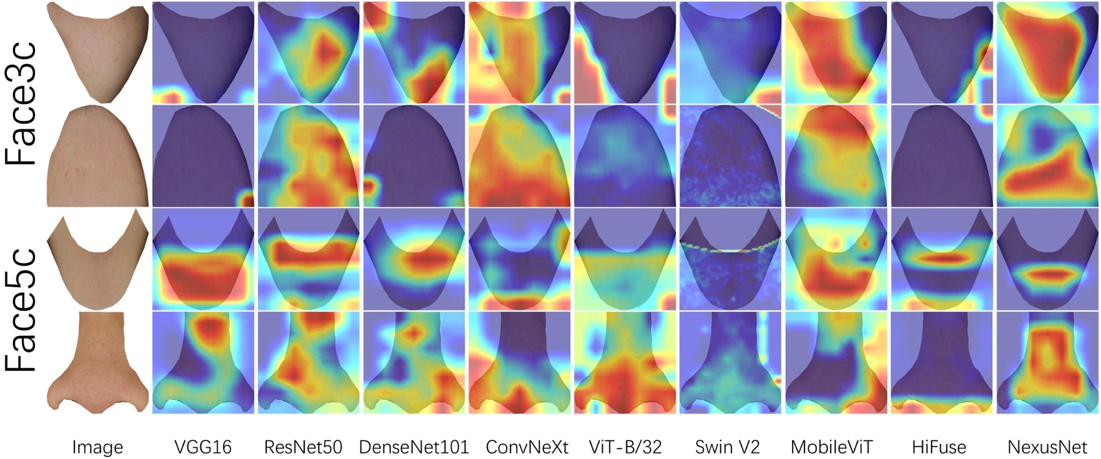 与现有的先进混合架构相比,如轻量级的MobileViT和特征融合网络HiFuse,它们在试图结合CNN与Transformer优势的同时,往往在参数效率、性能均衡性或泛化稳健性上做出了新的妥协。MobileViT虽专为移动端设计,但在本任务的数据集上表现不佳,在Face5c上的AP仅为44.98%,其热力图虽然红色显著区域显著,但常分散于目标边缘或目标与背景交界之处,定位精度不足。HiFuse在Face3c上取得了最高的单一精确率指标(AP 89.62%),但其参数量高达123.26M,且当面对类别更复杂的Face5c时,AP指标大幅下降25.28%,显示出明显的过拟合倾向和泛化短板,并且其热力图中所示显著响应区域多出现在图像边缘。与之形成鲜明对比的是。NexusNet通过其自适应多层次特征融合模块(MergeBlock),以多尺度注意力机制和Ghost卷积等轻量化技术,实现了双路径特征的高效、自适应融合。在将总参数量显著控制在73.37M(远低于HiFuse)的前提下,NexusNet不仅在Face3c上获得了最优的综合准确率(Acc)、召回率(AR)和特异度(AS),更在Face5c上展现了卓越的泛化稳定性,各项性能指标下降幅度最小,热力图始终能准确锁定核心特征并有效排除干扰。