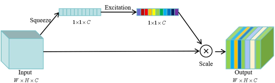 其中:s为所有通道的全局池化向量,W1与W2分别为降维与升维的权重矩阵,