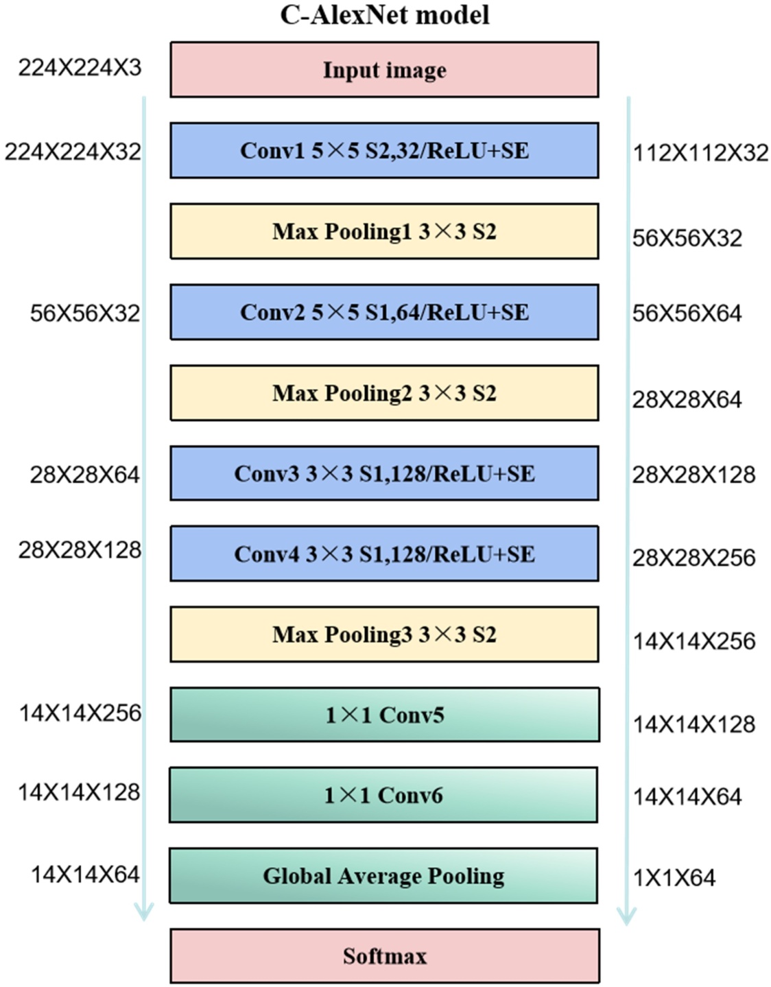 传统AlexNet网络由8层组成,包括5个卷积层与3个全连接层[9]。该模型依托ReLU激活函数与并行计算架构,在大规模图像识别中表现突出。然而,该结构的3层全连接层引入了大量参数,容易导致模型过拟合[10],并显著增加存储与计算负担;加之较深的层次结构,需要消耗更多内存来存储权重和激活值,从而限制了其在实时交互场景中的应用。为克服这些不足并提升模型适配性,本文在原始AlexNet基础上设计了轻量化改进模型C-AlexNet。
