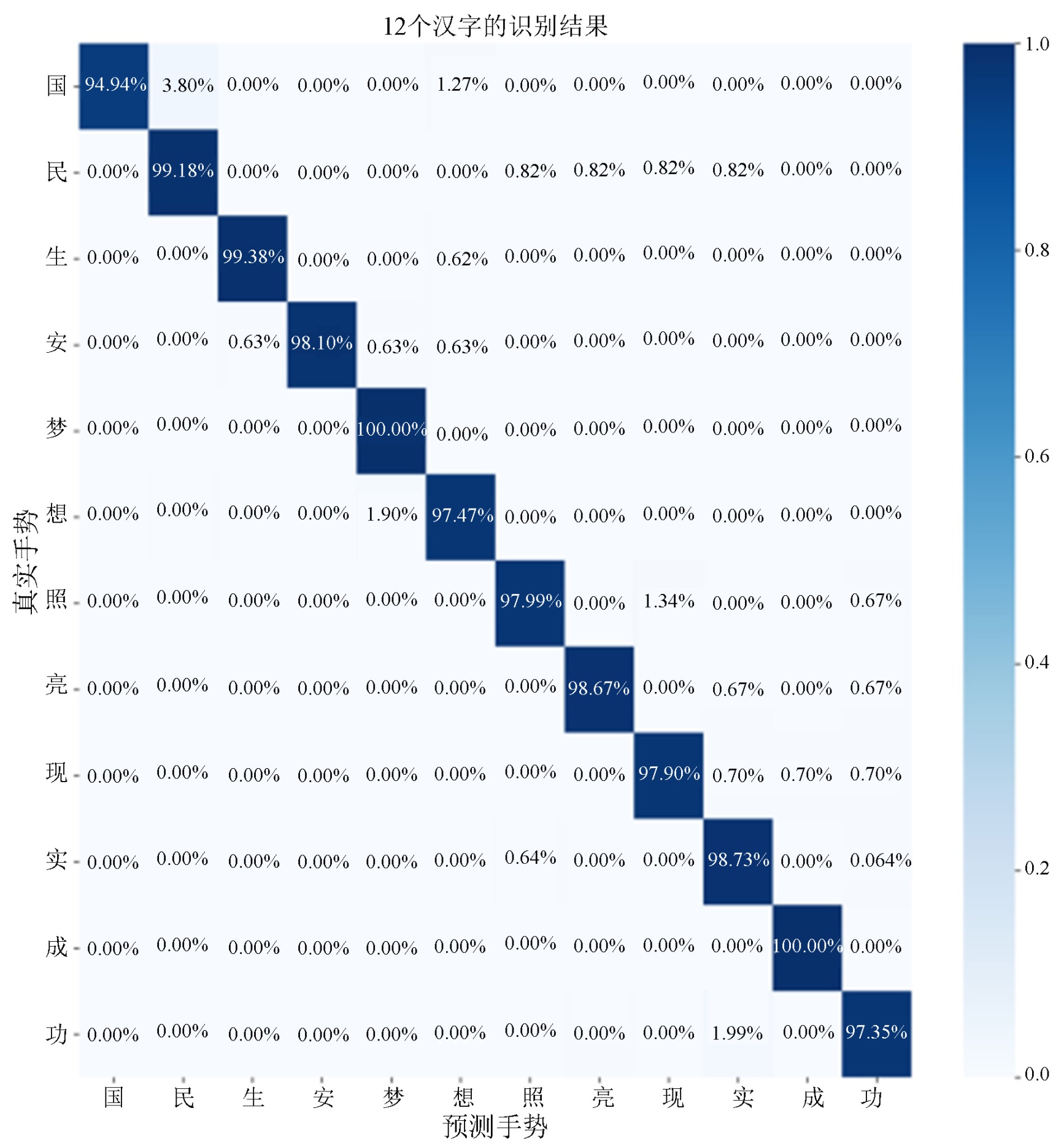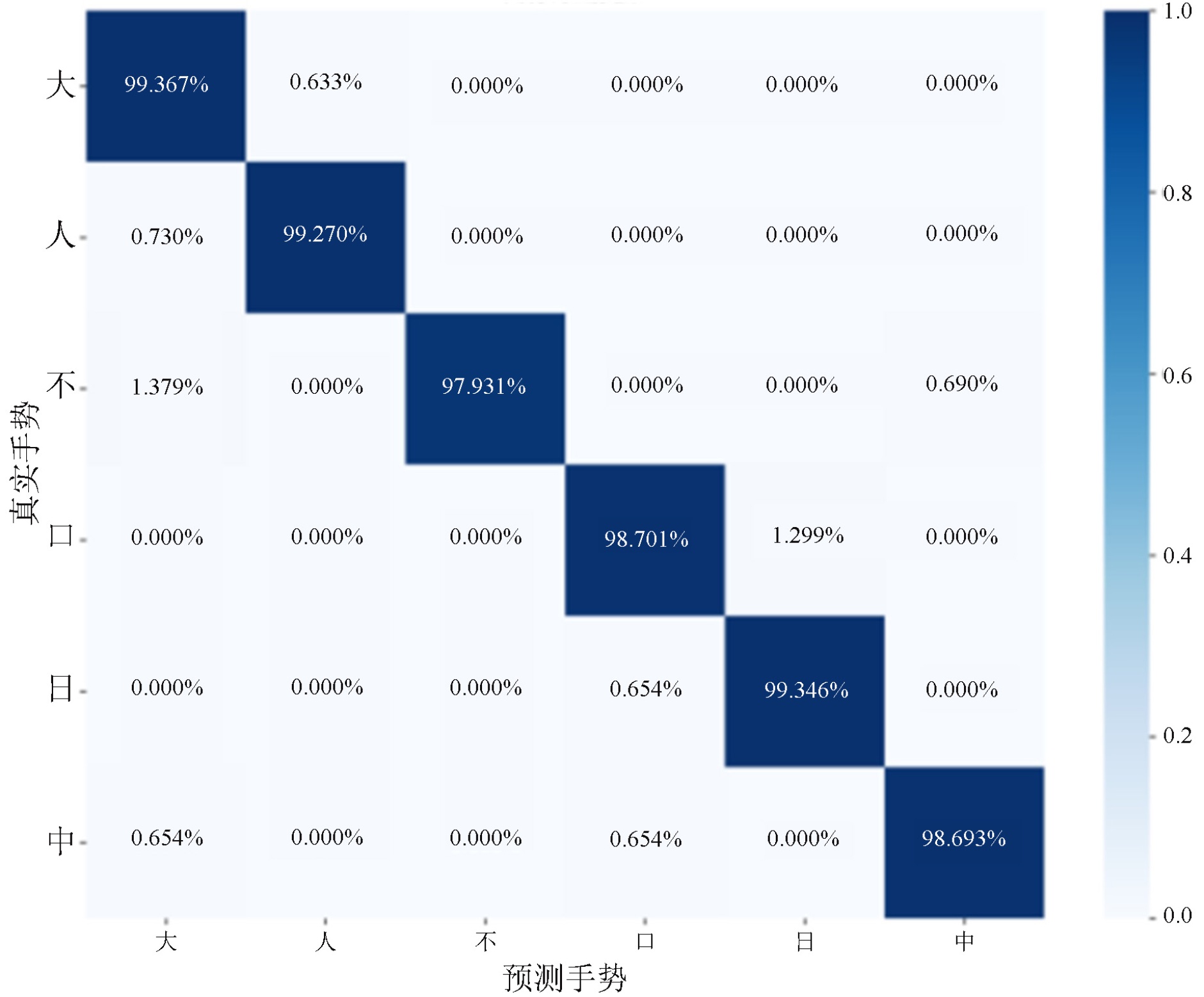 为全面评估所提出模型的识别性能,本研究将3个实验场景下采集的数据按70%训练、30%测试进行划分,并采用10折交叉验证策略提升泛化能力。具体操作为将训练集均分为10个子集,每次选取1个子集作为验证集,其余9个子集用于训练,循环10次并取平均结果。实验结果如图7所示,系统整体识别准确率达到98.88%,表现出优异的稳定性。在细粒度汉字手势识别中,即便“口”和“日”笔画相似,系统识别精度仍保持在98%以上,进一步验证了模型在复杂手势区分上的鲁棒性与应用潜力。