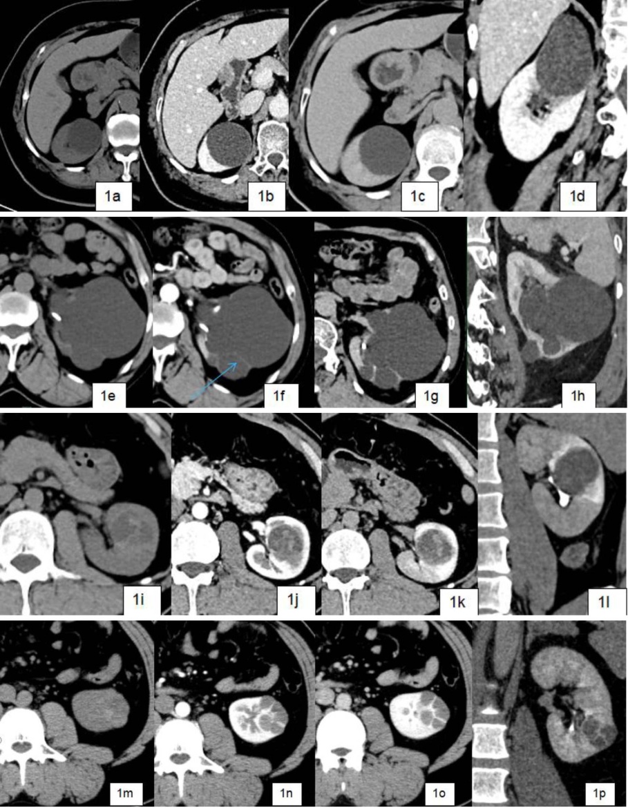 图1(m)~(p)左肾囊实性占位,内密度不均匀,可见实性成分,多发分隔,分隔 > 4 mm,边界不清,外侧壁可见结节状凸起,影像考虑囊性肾癌,病理结构为恶性;Bosnikak IVI级。