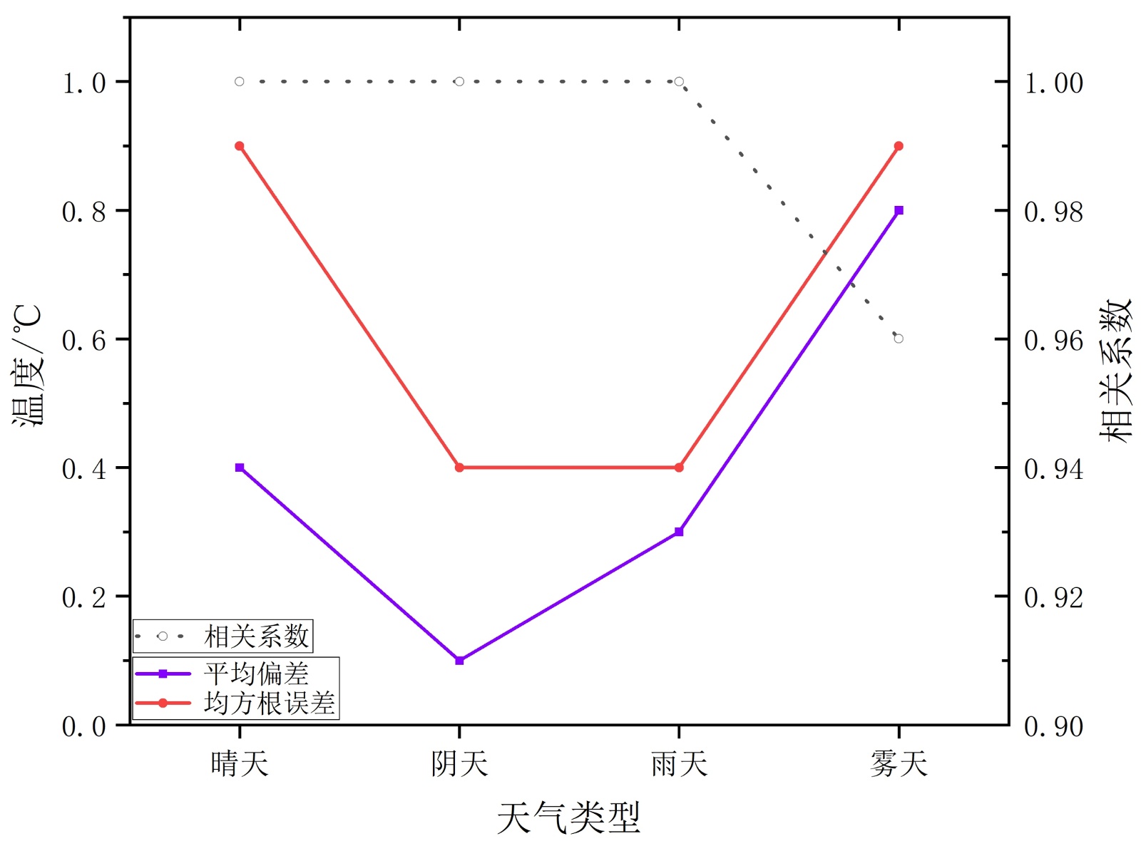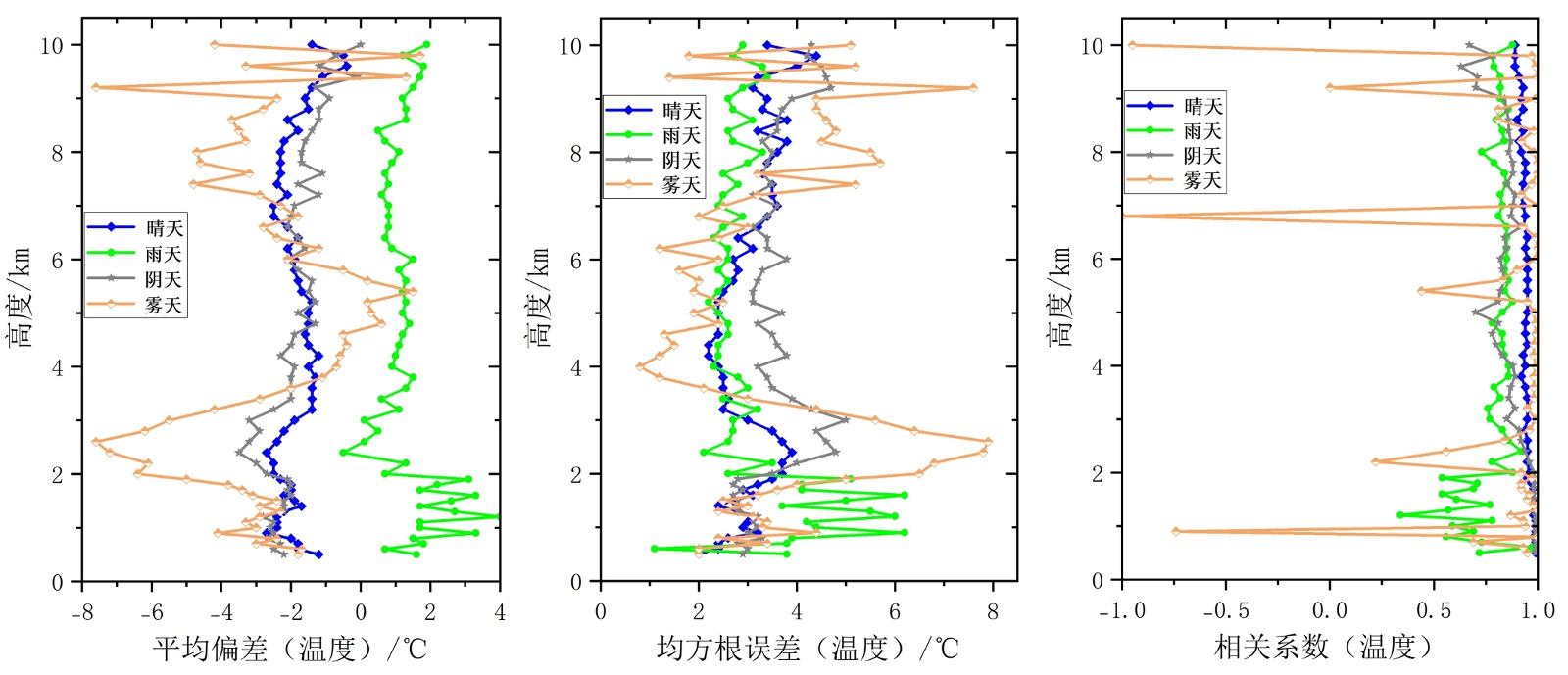 总体来看,晴天时平均偏差绝对值和均方根误差最小,其次是阴天,然后是雨天,三者差距不大。晴天、阴天、雨天的相关系数比雾天明显偏高,雾天的平均偏差、均方根误差和相关系数在各个高度层波动最大。晴天和阴天的平均偏差大致在−2℃左右,雨天的平均偏差大致在2℃左右,三者的均方根误差大致都在3℃~4℃左右。说明满天云和降水对微波辐射计对温度的探测精度影响不大。