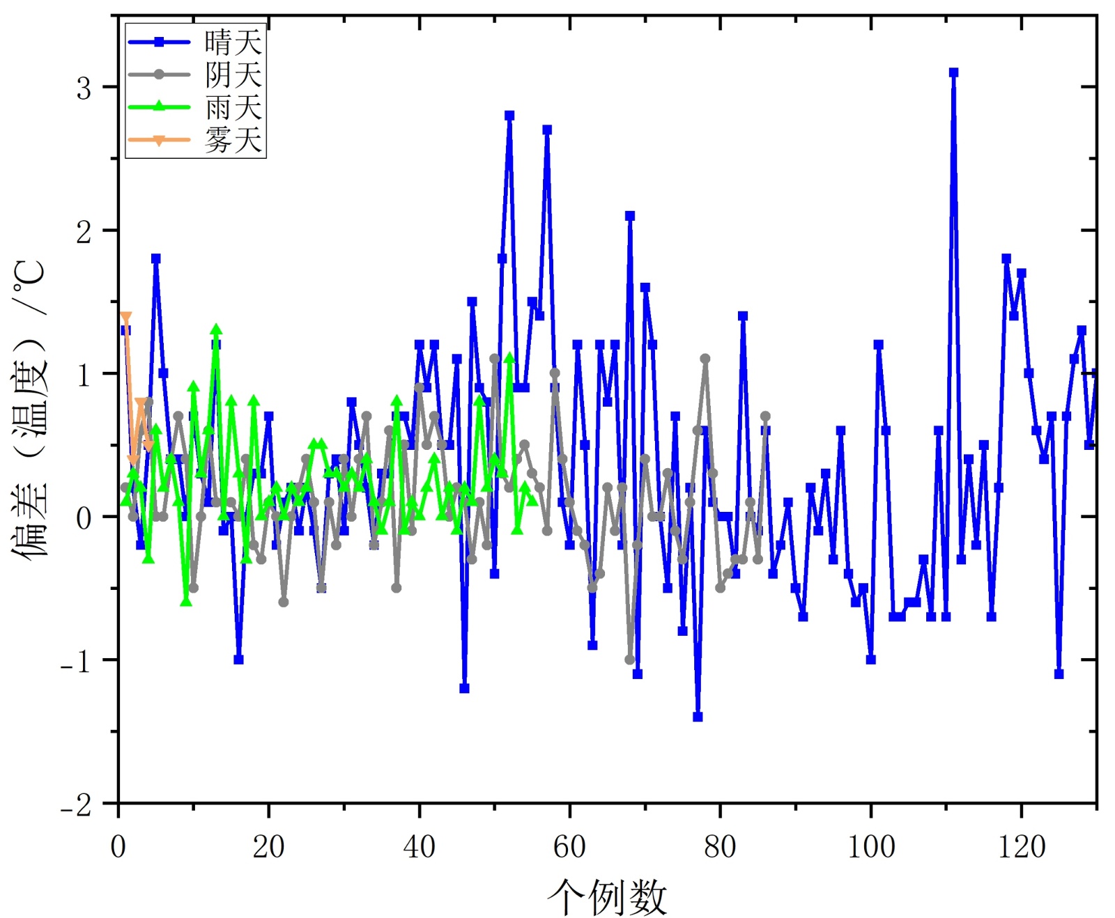 从图1不同天气条件来看,地面温度的平均偏差和均方根误差在阴天和雨天时最低,均在0.5℃以内,在晴天和雾天相对较大,但也都在1℃以内。两组数据的相关系数在晴天、阴天、雨天都为1,雾天也达到了0.96,说明在不同天气条件下两组数据都表现出较好的相关性。从图2来看,晴天个例数最多,偏差幅度较大,在−1.5℃~3℃之间,偏差幅度在−1℃~1℃之间的个例占比77%,超过3/4。而阴天和雨天个例数较少,且偏差幅度大多在−1℃~1℃之间。雾天个例数最少,偏差幅度在0.4℃~1.4℃之间,仅有1个个例的偏差幅度超过了1℃。