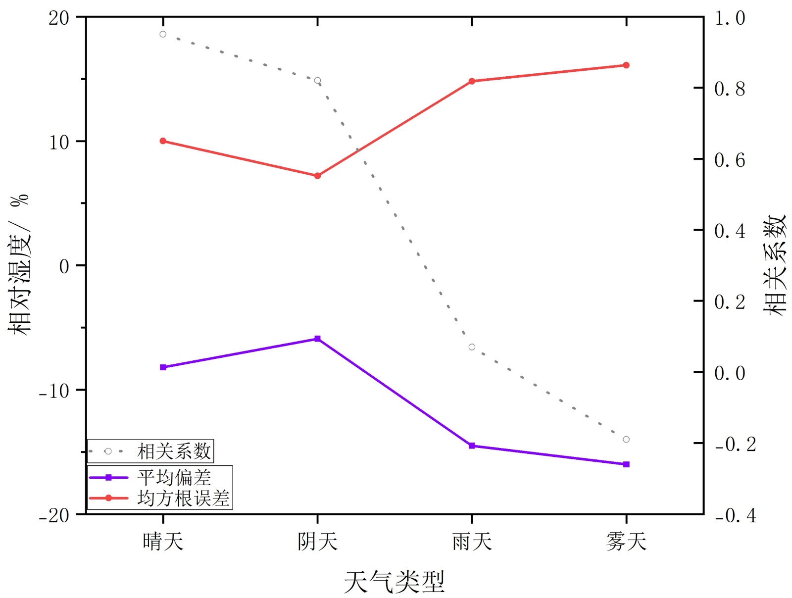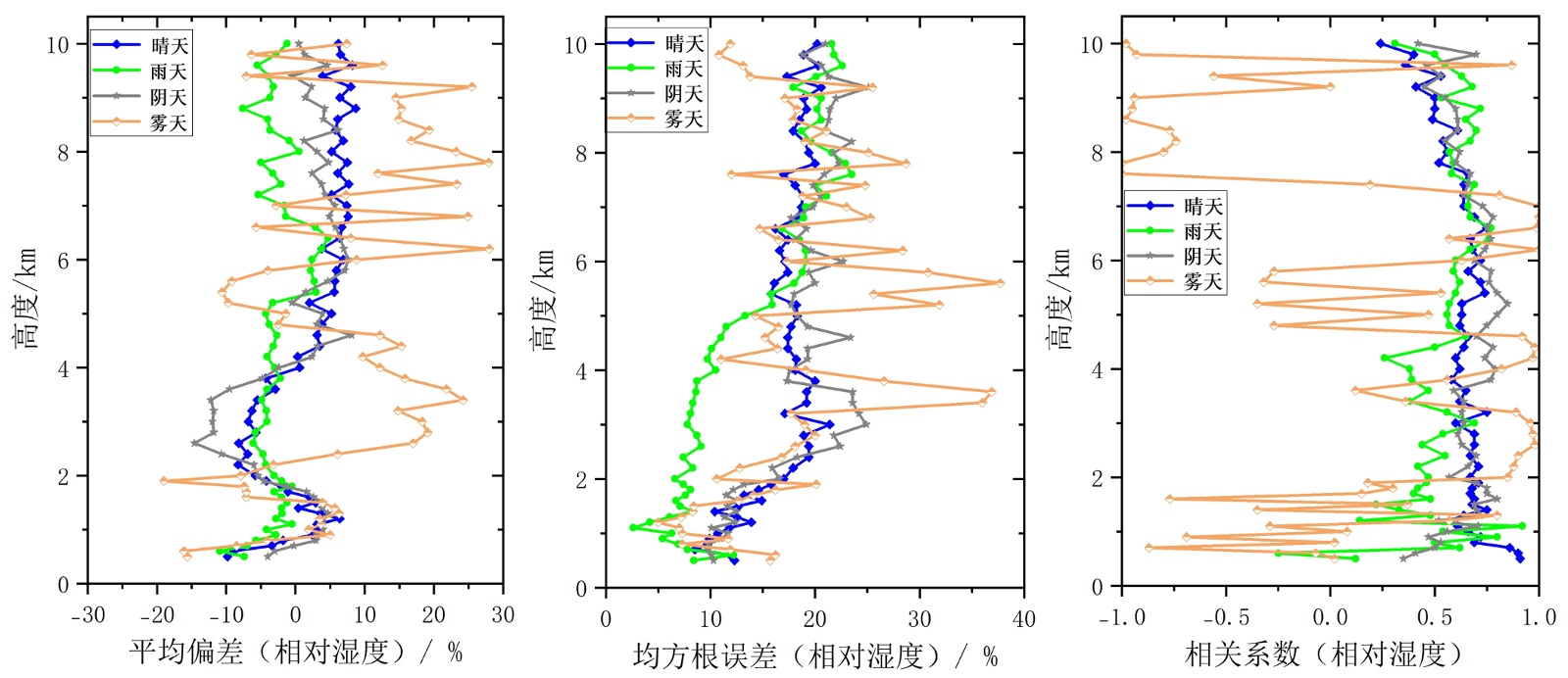 从相对湿度的均方根误差来看,晴天条件下在8.5%~21.4%之间,阴天条件下在9.8%~25.1%之间,阴天的偏差略大,差距在5%以内。对于雨天,均方根误差在2.6%~23.5%之间,但在5 km以下高度数值明显偏低,都在10%附近,而在5 km以上高度,都在20%附近。雾天条件下的均方根误差值分布和平均偏差类似。