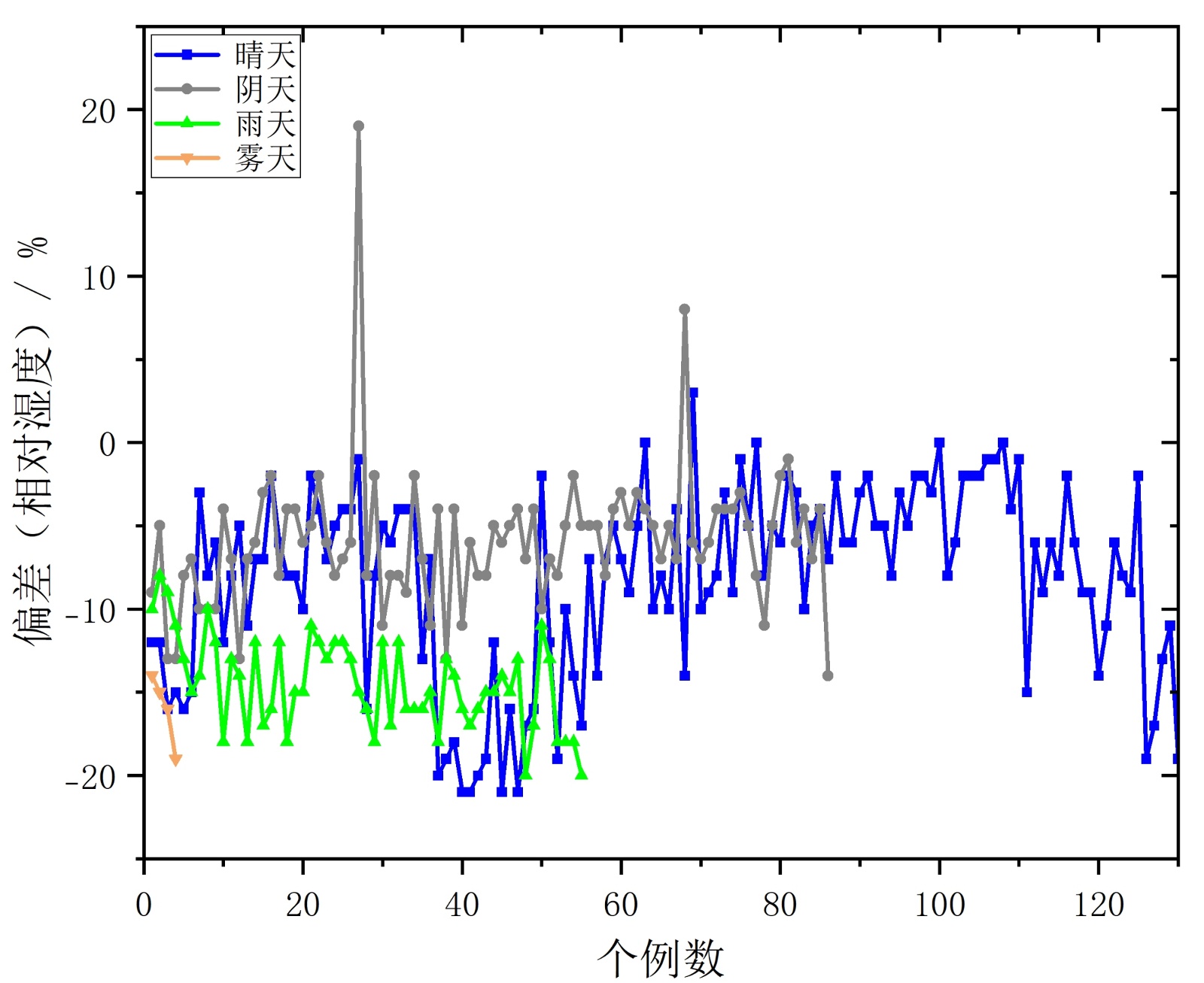 从图4来看,在总共275个个例中,仅有3个个例的相对湿度偏差是正值,也就是说微波辐射计探测的地面相对湿度基本都是偏低的。在不同天气条件下,地面相对湿度的偏差幅度在阴天最小,晴天次之,雨天和雾天较大。