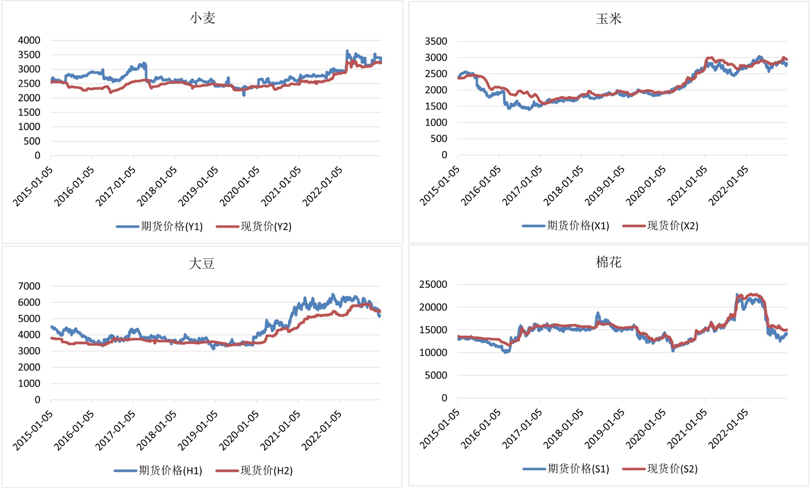 数据选取自国泰安数据库,涵盖玉米、小麦、大豆、棉花四种农产品的期货与现货相关数据,样本区间设定为2015年1月1日至2022年12月31日。该区间内共包含1947个交易日,对应每种农产品的期货价格与现货价格均各有1947个观测值。