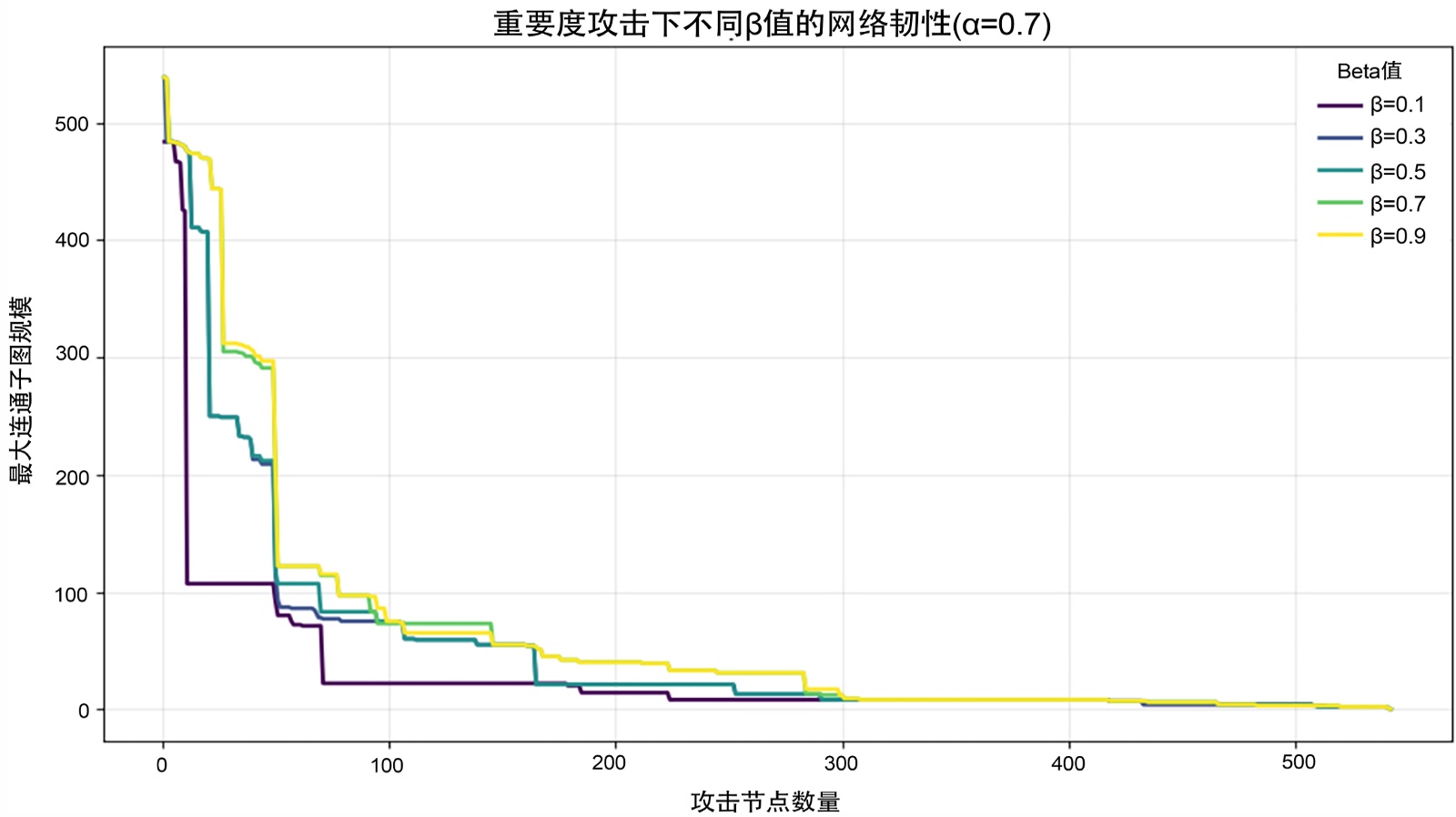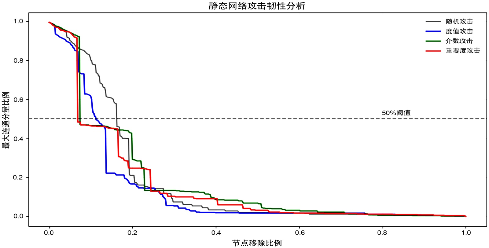 2) 关键节点识别的辩证视角:虽然构建的综合重要度指标为识别关键节点提供了更全面的视角,但仿真中介数中心性攻击展现的惊人破坏力警示我们:综合指标可能“稀释”某些单一但至关重要的脆弱性。因此,未来风险评估需结合“综合评估”与“单点预警”策略,既把握全局,也重点监控具有极端拓扑特性的节点。