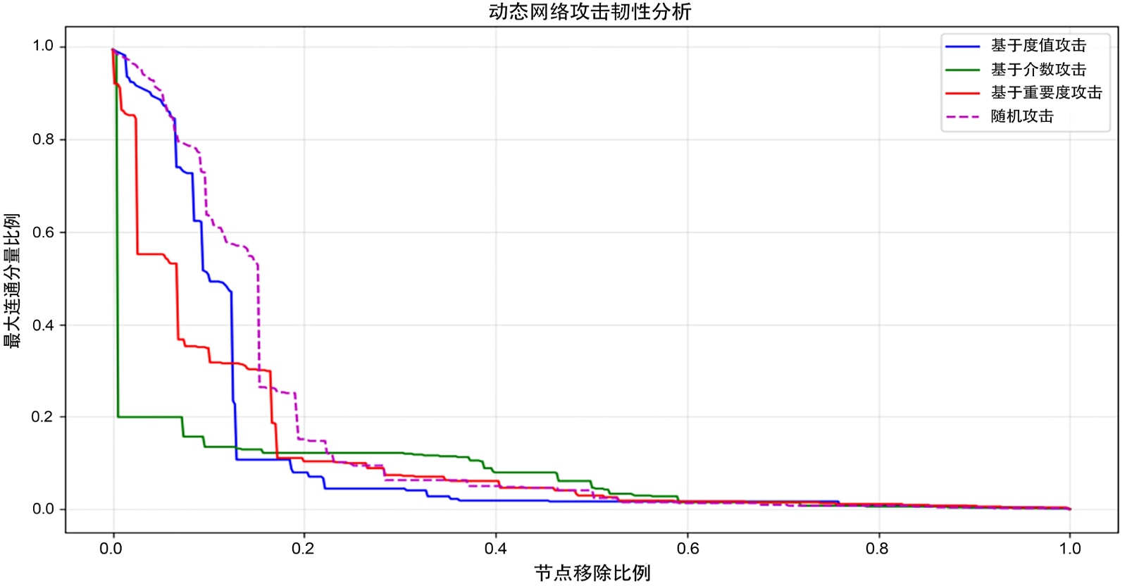 图中可以看出在静态网络中随着随机攻击方式下节点在最大连通子图比例在50%之前下降缓慢除随机攻击之外其他攻击方式处于相似的下降趋势,均为前期下降迅速后期下降平缓,说明在只考虑静态韧性的情况下,网络在随机攻击策略下有较强的韧性。在最大连通子图比例在50%之前时,蓄意攻击下的网络最大连通子图下降显著,对于网络的影响要大于随机攻击。但在静态网络下,随机攻击和蓄意攻击的整体趋势相似,两者均在节点移除比例在0.6时最大连通子图比例趋近于零。