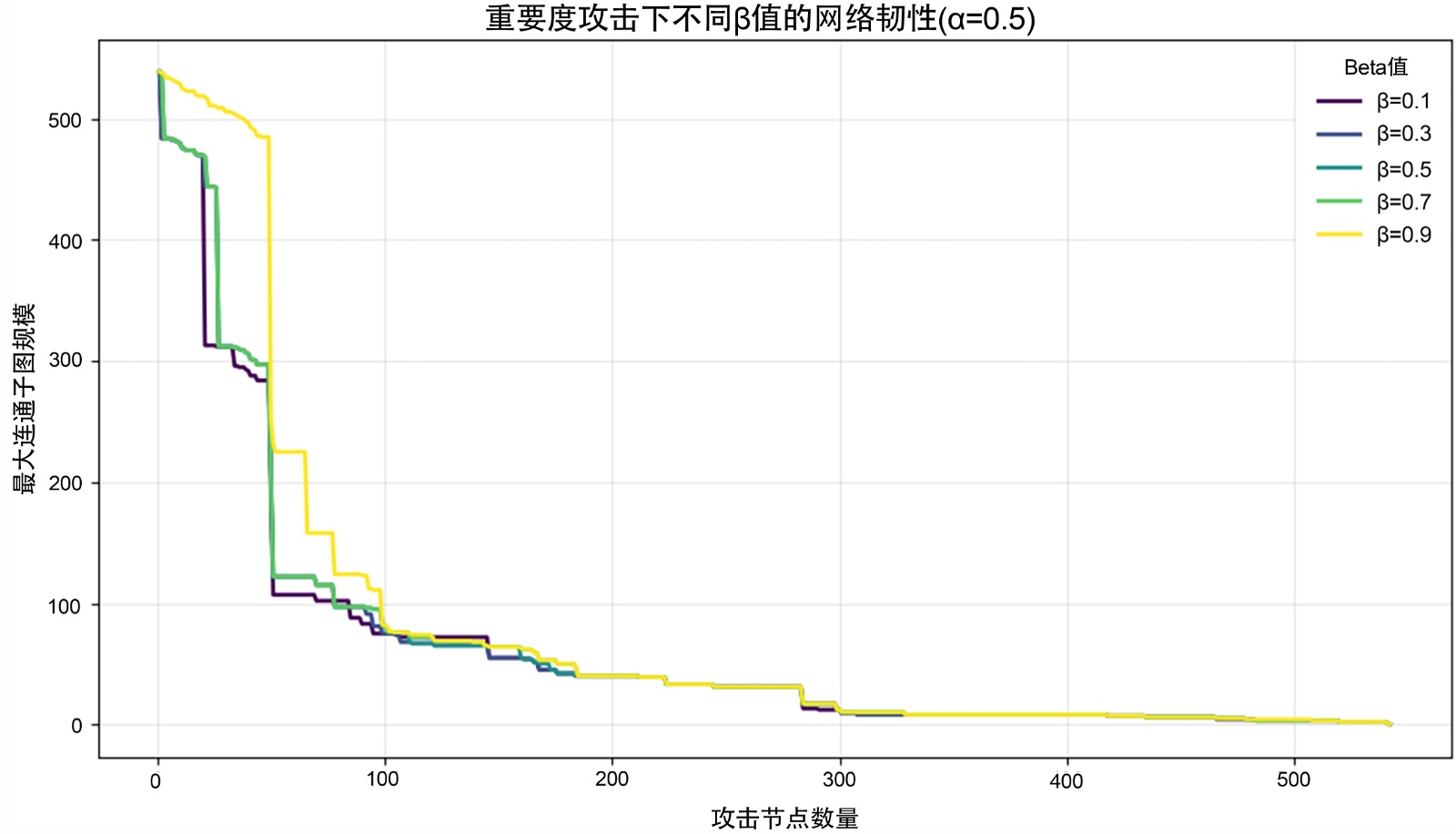 三次实验可以明显看出当α的值确定时随着β值的增大,折线的下降趋势越缓,β = 0.9时最大连通子图下降速度最慢,但当α = 0.3和α = 0.5时,相同β的取值对于网络最大连通子图的影响并不显著,当α = 0.7时相同β值对比α = 0.3、0.5时区别更为显著,当α大于一定值时,对于网络的影响会显著增加,并且会使网络最大连通子图的下降趋势更加显著,依据2.1.1中的公式3可知,当