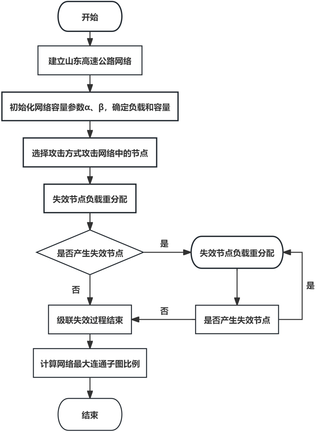 本研究旨在构建一个适用于山东高速公路网络的级联失效模型,其核心在于对网络中节点(收费站)的初始负载、承载容量以及失效后负载如何重新分配的机制进行合理设定与优化。通过此模型,后续将能对不同参数配置及攻击策略下网络的韧性进行量化分析。