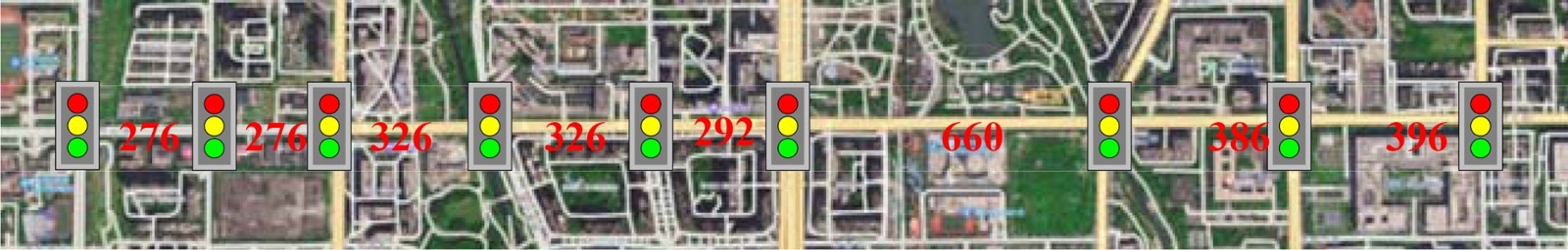 为了评估所提出的M-EAD算法的性能,在配备Intel Core i5-12600KF处理器和32GB RAM的计算机上使用Simulink + CarSim + Prescan构建了一个仿真环境进行仿真测试。实验模拟了成都市的真实城市交通环境,该环境包含九个非均匀分布的信号交叉口,如图3所示。每个交叉口都配备了V2X设备,将SPaT信息传输到网联汽车。