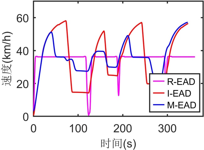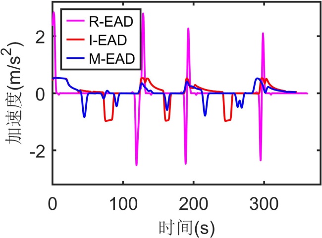 图4(b)显示了M-EAD具有更平滑的速度曲线,最小速度为20.71 km/h,最大速度为51.02 km/h,平均速度为36.35 km/h。相比之下,I-EAD表现出明显的速度振荡,并且R-EAD更为明显,甚至在部分交叉口出现了停车现象。图4(c)证实了M-EAD不存在高振幅加速度波动,无论是在起步阶段还是终点停车阶段。