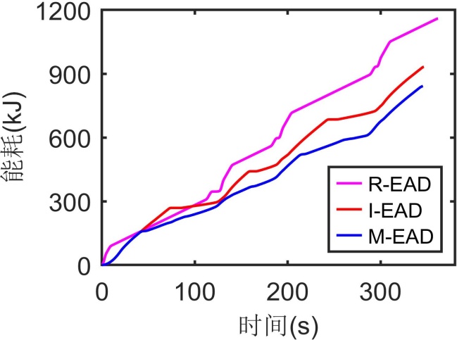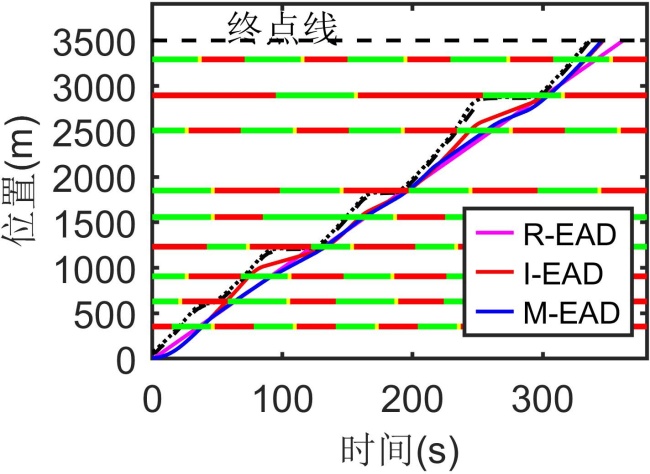 如图4(d)所示,M-EAD的能耗一直维持在较低水平,并且能耗曲线相较于I-EAD和R-EAD更加平缓,没有突然的波动,这也印证了加速度和速度曲线。在整个行程中,M-EAD的能耗为846.5 kJ,I-EAD的能耗为935.1 kJ,R-EAD的能耗为1161.3 kJ,相较于I-EAD和R-EAD,M-EAD能耗减少为9.47%和24.15%。M-EAD通过消除固有的走走停停模式,在混合交通环境中实现平滑地通过连续交叉路口,实现了显著的节能。