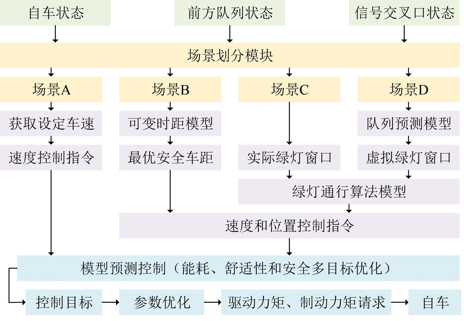 数值,通过如图2所示的逻辑判定划分当前交通场景,再根据场景类型调用对应的专属规划模块(具体模块设计见3.2节)。各规划模块根据场景特性规划对应的速度区间,同时明确该场景下的约束条件,为下层MPC算法提供输入,确保MPC在满足场景需求的前提下实现生态驾驶目标。