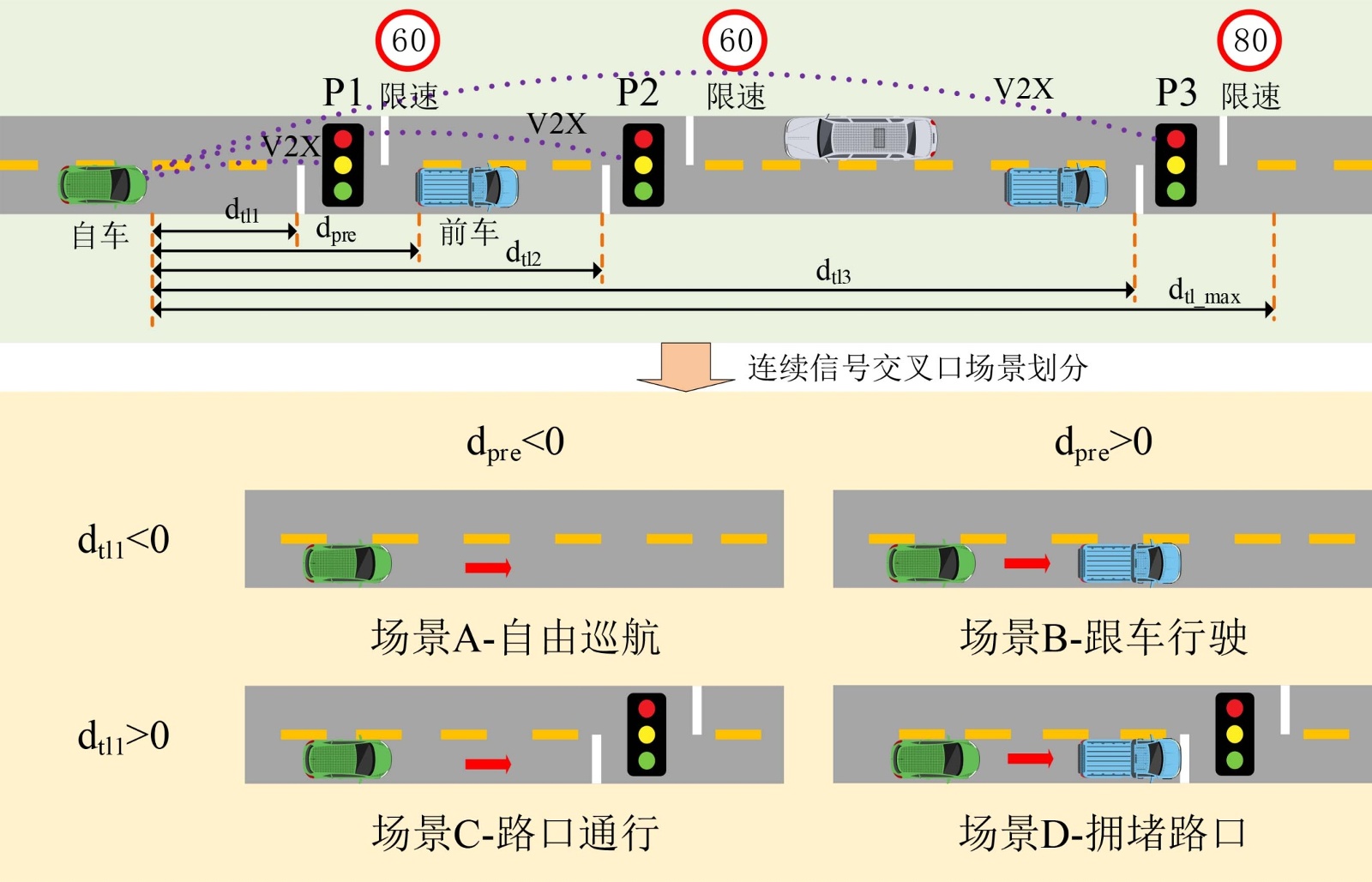 )可对交通场景进行划分,得到4个基本交通场景:场景A-自由巡航、场景B-跟车行驶、场景C-路口通行和场景D-拥堵路口。