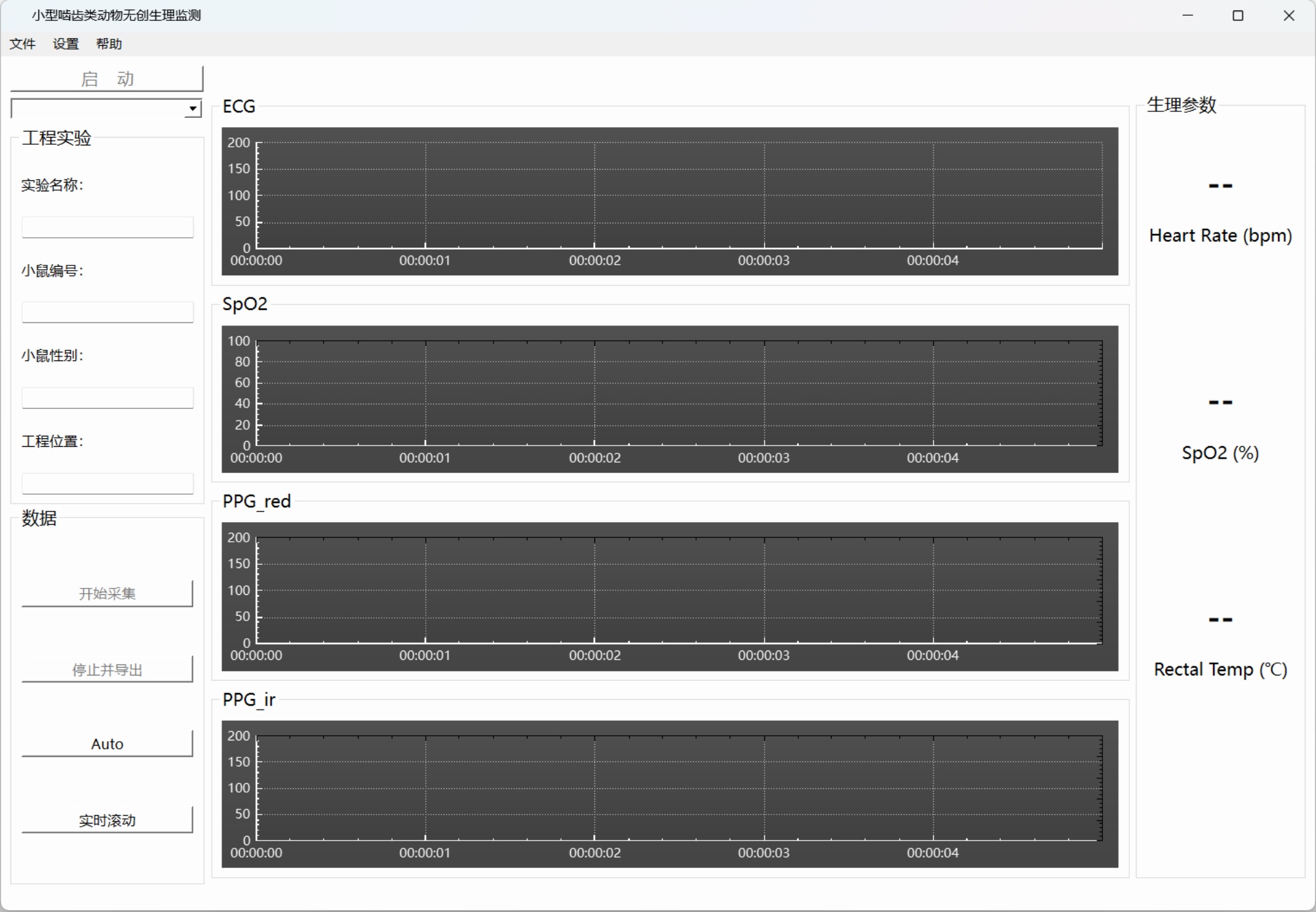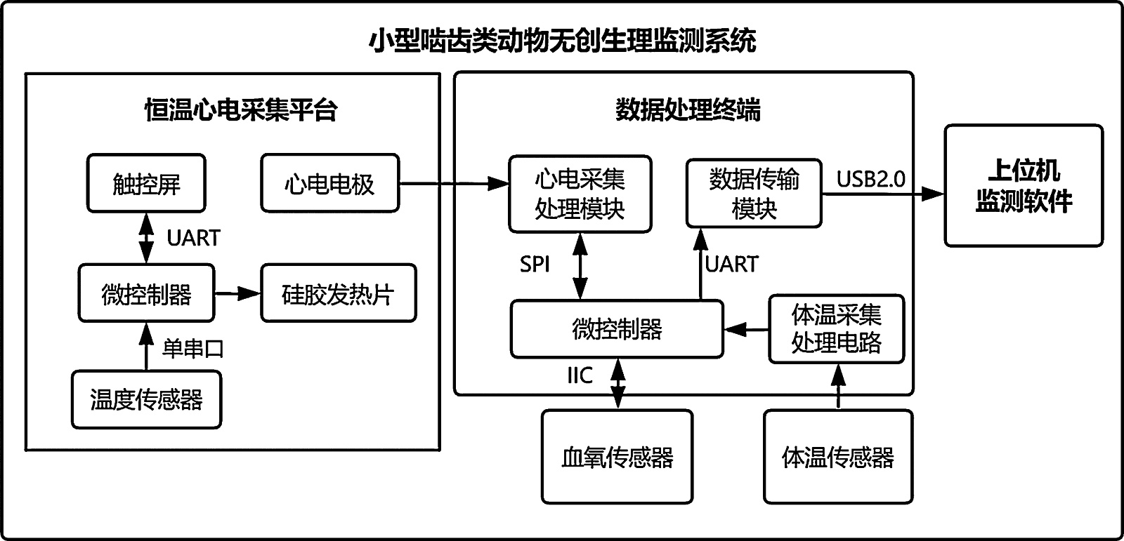 小型啮齿类动物是生物医学研究[1],尤其是临床前药效评估[2] [3]、生理学分析[4] [5]、安全性评价[6] [7]及实验手术模型[8] [9]中的核心实验对象。在此类研究中,实验动物常处于麻醉状态,而对其生命体征进行实时同步监测,是麻醉深度评估[10]及实验结果解读的基础[11]。然而,当前麻醉动物的生理参数监测仍面临一系列技术挑战:首先,传统监测方法通常依赖多个独立的设备,连接线缆复杂,操作不便[12],易对精细的手术或实验操作造成干扰,同时难以保证不同参数间的时间同步性。其次,麻醉药物会显著抑制动物的体温调节中枢。而小型啮齿类动物的体表面积与体积比(SA/V)大,热量通过体表散失的效率高,体温易快速下降[13] [14]。若无主动保温措施,极易导致低温症,从而严重干扰实验结果甚至危及动物生命。此外,在小型啮齿类动物生理参数监测过程中,仍面临诸多技术挑战。例如,常规心电电极因动物体型所限,存在夹持困难与易脱落的问题;针式电极虽可替代,但其有创性会对实验动物造成应激影响[15]。同时,植入式遥测技术虽能实现长期监测[16] [17],但手术本身及术后恢复期增加了实验的复杂性。在血氧与体温监测方面,采集探头普遍存在适配性问题[18] [19]。当前市面上已有的部分商业监测设备仍存在若干局限性。例如,Starr Life Sciences公司的MouseOx Plus无创生理监护仪不具备心电采集功能,缺乏将手术平台与生理监测系统进行整合的设计;Harvard Apparatus公司的小动物无创生理监测系统在信号处理方面表现不足,未能有效解决基线漂移问题;而INDUS公司的啮齿动物外科手术监测系统则存在数据分析功能较弱的问题,缺乏对高质量信号的去噪、异常检测及滤波功能,同时不支持参数自定义,用户无法根据实验需求调整参数以优化信号质量。