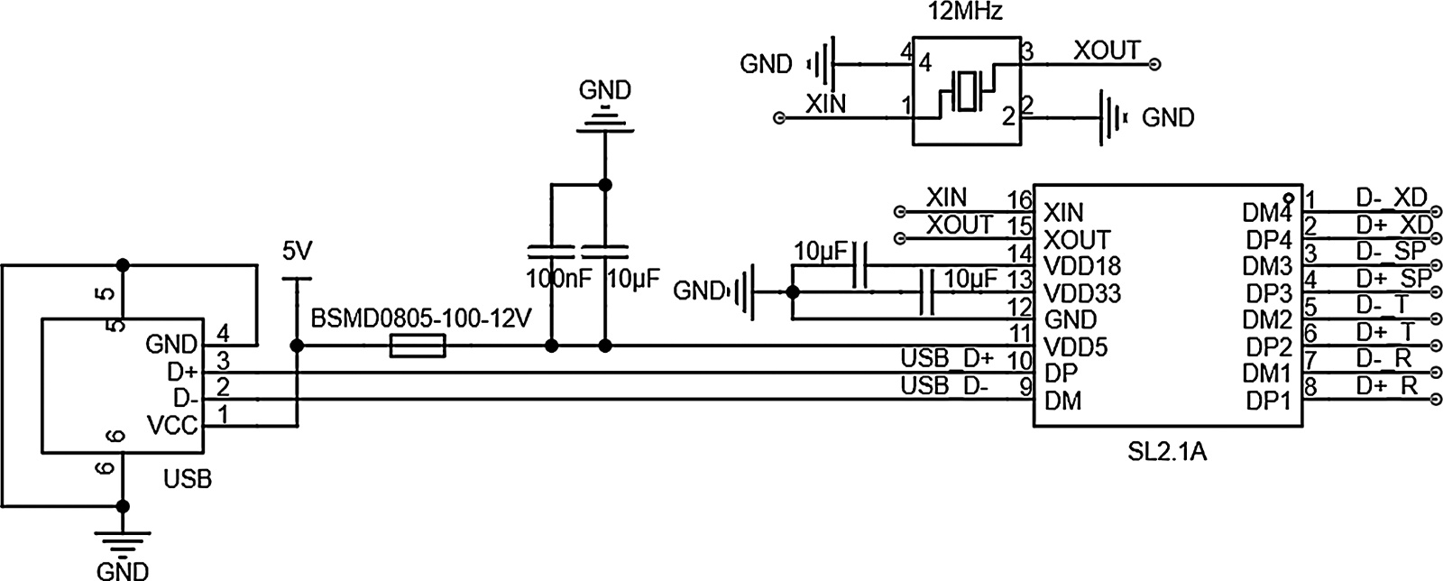 为实现多路生理信号的同步采集与传输,设计USB 2.0集线器将多路数据整合,并经由单一上行端口与上位机通信。具体而言,各微控制器通过CH340E串口转USB协议转换芯片将数据传送至集线器主控芯片SL2.1A。该芯片具备高集成度、高性能与低功耗特性,其内部采用STT (Single Transaction Translator)技术,单电源供电方式。集线器电路设计如图6所示,为确保可靠性,在5V供电线(VCC)上串联保险丝以实现过流保护,同时采用0.1 μF与10 μF电容并联的组合策略,有效滤除电源网络中的宽频带噪声。