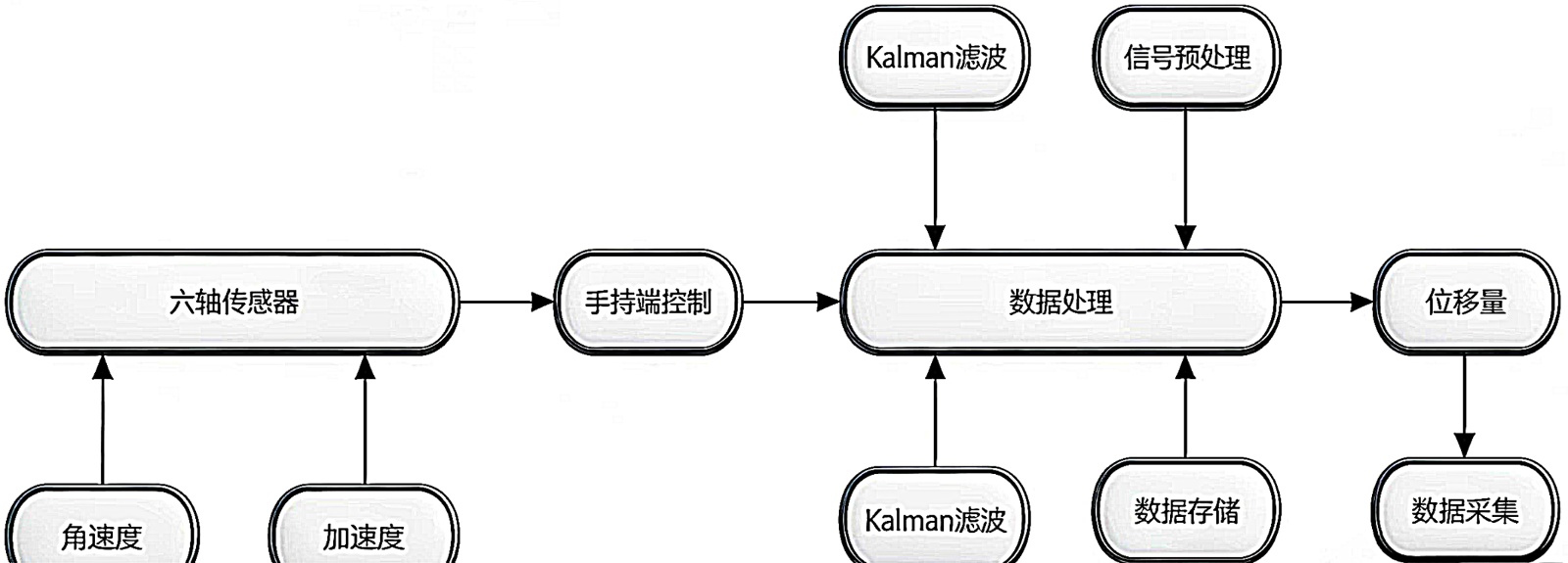 六轴传感器实时采集运动数据,通过手持端触发数据采集并标记初始时间节点。数据由卡尔曼滤波去除噪声后,由下位机完成姿态解算与初步融合,最终传输至上位机通过复化辛普森积分算法计算位移量。