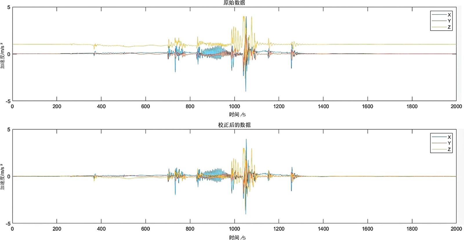 有效平滑高频毛刺,使波形趋于稳定,信号波动范围收窄至−0.2 g至0.2 g,信噪比提升约15 dB,均方根误差从0.85 g降至0.12 g,有效成分占比提高,为位移计算提供可靠的数据基础,该对比直观体现卡尔曼滤波抑制高频噪声、提升信号质量的优势,验证了预处理环节对确保短时运行姿态测量精度的关键作用。