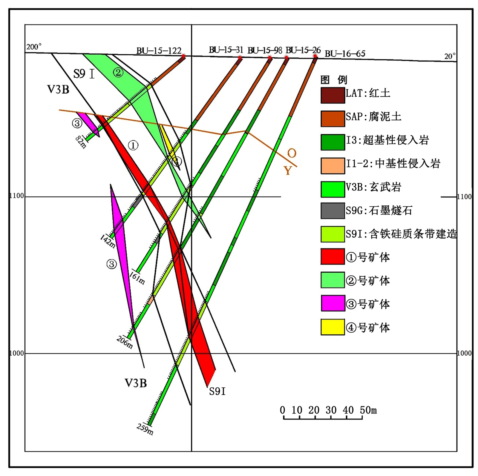 Figure 2. Cross-sectional distribution of ore bodies ①, ②, ③ and ④ along the L7_50 mE Line