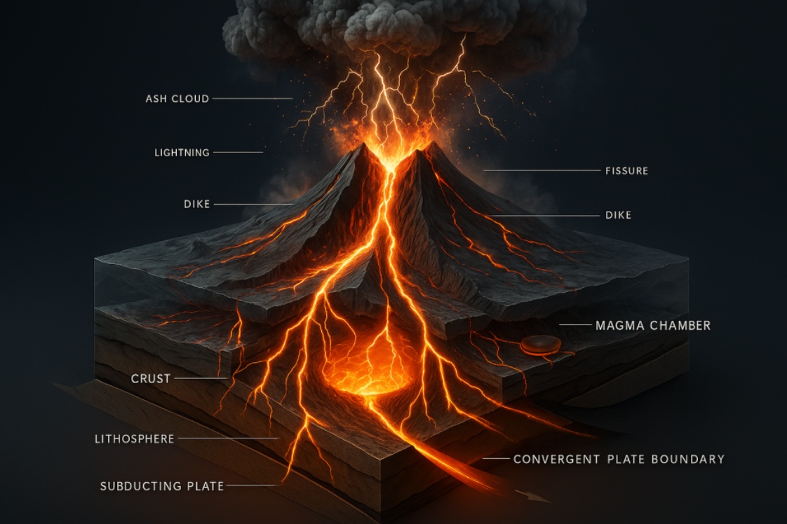 “exploded cutaway 3D infographic of a volcano mid-eruption, twin upper cones violently shattered, magma fragments and ash cloud bursting outward, dense eruption column spiraling upward with visible lightning bolts, glowing lava flowing through multiple fissures and dikes, subsurface layers fully revealed with magma chamber, dike networks, and gas reservoirs highlighted, tectonic convergence zone beneath crust and lithosphere with clear subduction arrows, strong bottom lighting emphasizing thermal plumes and shockwaves, photorealistic style with clean English scientific labels --v 6 --style raw --ar 16:9”