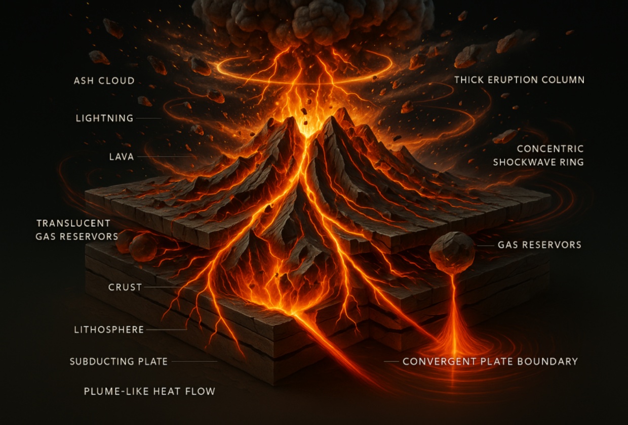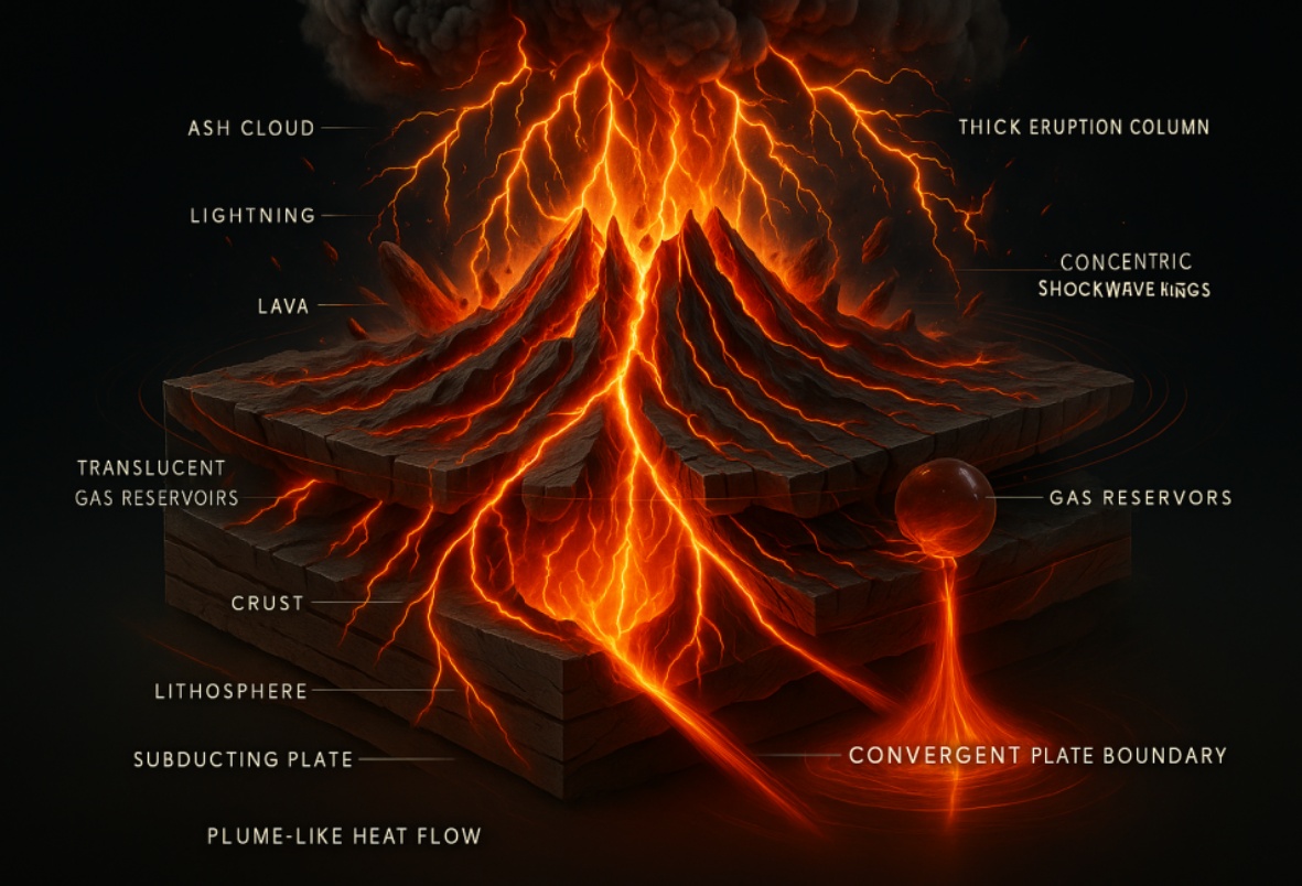 “exploded cutaway 3D infographic of a volcano mid-eruption, twin volcanic cones violently shattered with magma fragments and ash bursting outward, thick eruption column spiraling upward with embedded lightning bolts, concentric shockwave rings radiating from the blast, glowing lava flowing through fissures and dike networks, underground gas reservoirs visible as translucent pockets, fully exposed crust, lithosphere and subducting plate structure in a convergent tectonic setting, directional light from below highlighting thermal plumes and tectonic stress, photorealistic, labeled scientific diagram in English --v 6 --ar 16:9 --style raw”
