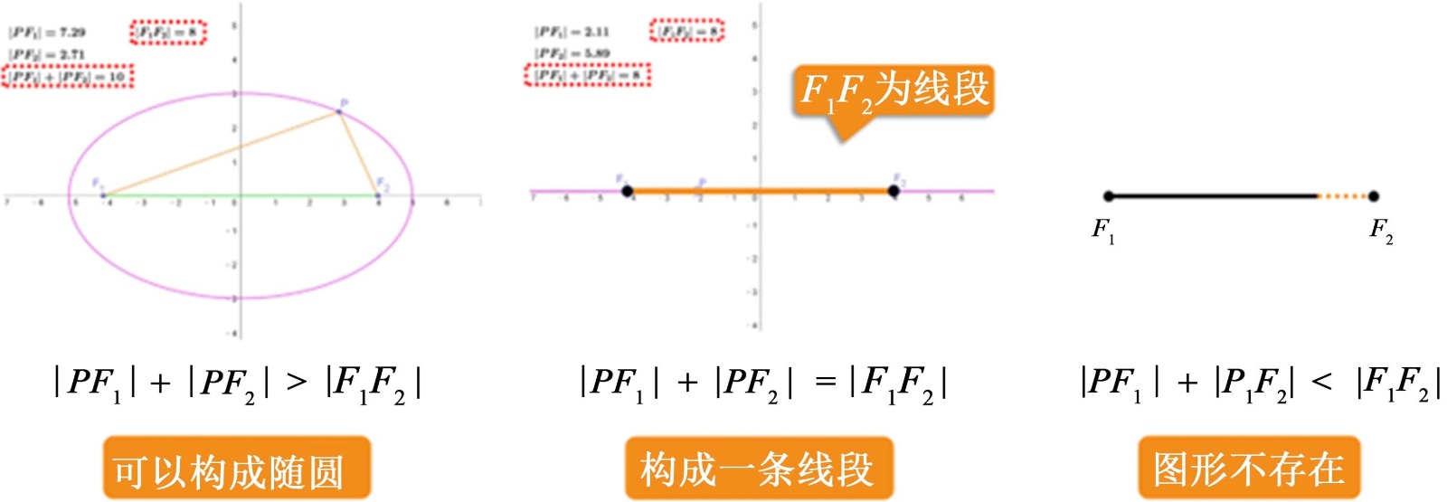 然后教师运用信息技术展示画椭圆的过程以及动点到定点的距离与两定点间距离的三种比大小情况,如图3。并不断追问学生,引导学生通过观察、讨论,对椭圆的几何特征进行探究,体会分类讨论的数学思想方法。教学片段举例如下: