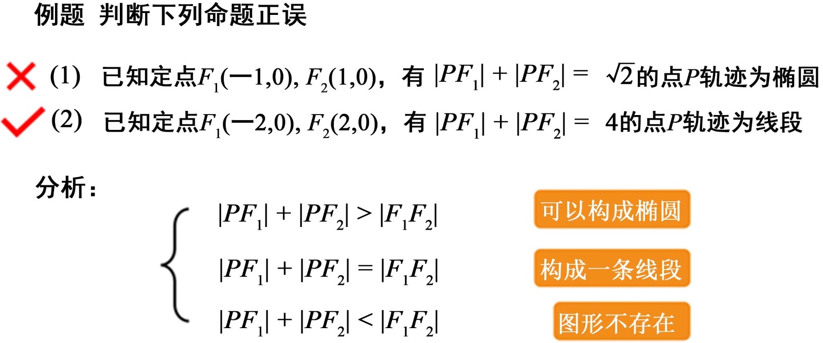 【观测点】:能否准确表述椭圆定义中的三个要素(两个定点、距离和、常数大于焦距);能否运用定义解决轨迹存在性问题;能否识别常见错误(如忽略“常数 >