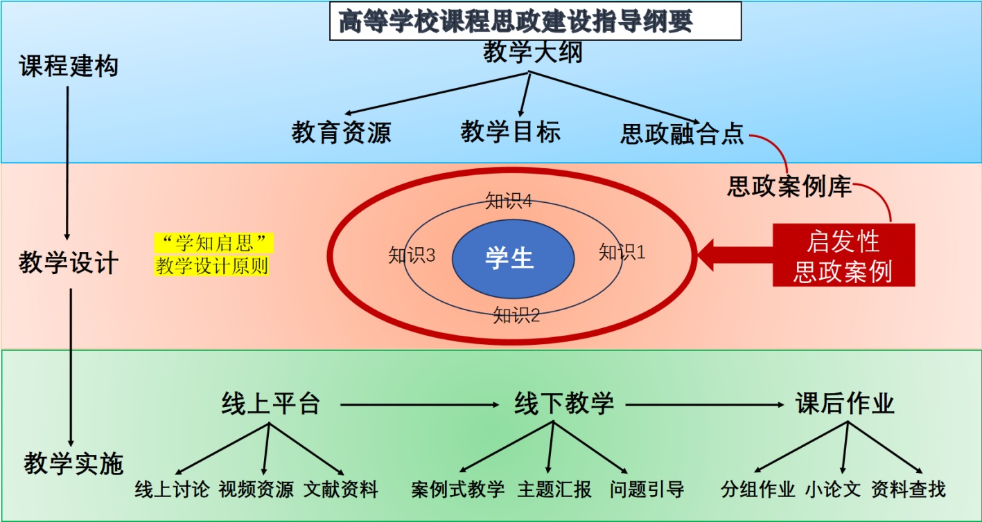 基于《纲要》和本专业的育人目标制定课程思政教学目标和课程知识能力目标;课程教学大纲加入课程思政内容,修订教学大纲;完成课程政教育资源的挖掘,构建课程思政案例库;教师团队在提出“学知启思”的教学设计原则基础上精心落实课程思政教学设计,科学构筑课程思政教学体系。