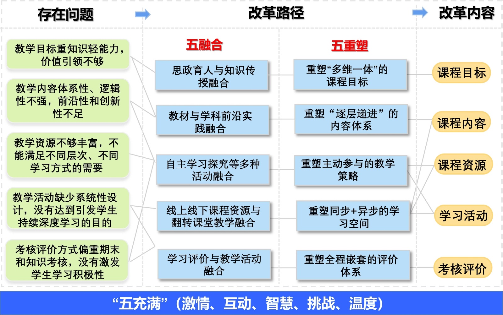 摘要: 文章针对教学过程中存在的教学内容体系性、逻辑性不强,前沿性和创新性不足;教学活动缺少系统性设计,没有达到引发学生持续深度学习的目的;考核评价方式偏重学科专业知识,课程思政知识在课程评价环节中没有受到应有的重视等三个痛点问题,通过整合教学内容与创新实践资源,将教学内容与创新实践深度融合,强化学生科研素养和创新思维;通过创新课堂模式解决“课程教学过程中学生主动参与度及学习效率低”,不能达成持续深度学习的问题;针对课程思政目标在考核评价中未受到重视的问题,提出一套针对教学目标的合理的考核评价体系。分别从课程目标、课程内容、课程资源、学习活动、考核评价五个方面进行深入改革,通过“五融合”,实现“五重塑”,达成“五充满”课堂,实现学生知识、能力和素质三方面的综合培养。