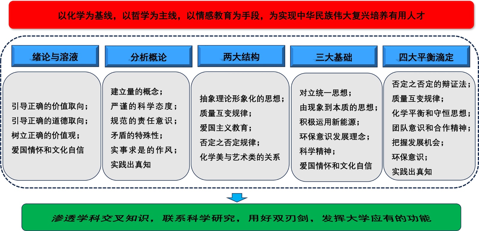 本文紧紧围绕无机及分析化学教学过程中的五大问题,从教学目标、教学内容、课程资源、学习活动、考核评价等五个方面深入改革,通过“五融入”实现“五重塑”。围绕“结构–性质–应用”的主线重新构建课程内容,提出将创新创业教育与课程教学内容深度融合,理实结合,逐层递进;优化混合式教学模式,实施“课前师生互通–课中翻转课堂–课后师生反思”的三段式教学引发学生持续深度学习;建立了结合课程思政目标的考核评价体系。在整个教学全过程中,我们润物无声地融入思政理念,形成鲜明的专业课程特色,培养了学生的科学思维、学科素养和创新创业能力,实现知识传授、能力培养、价值塑造深度融合。