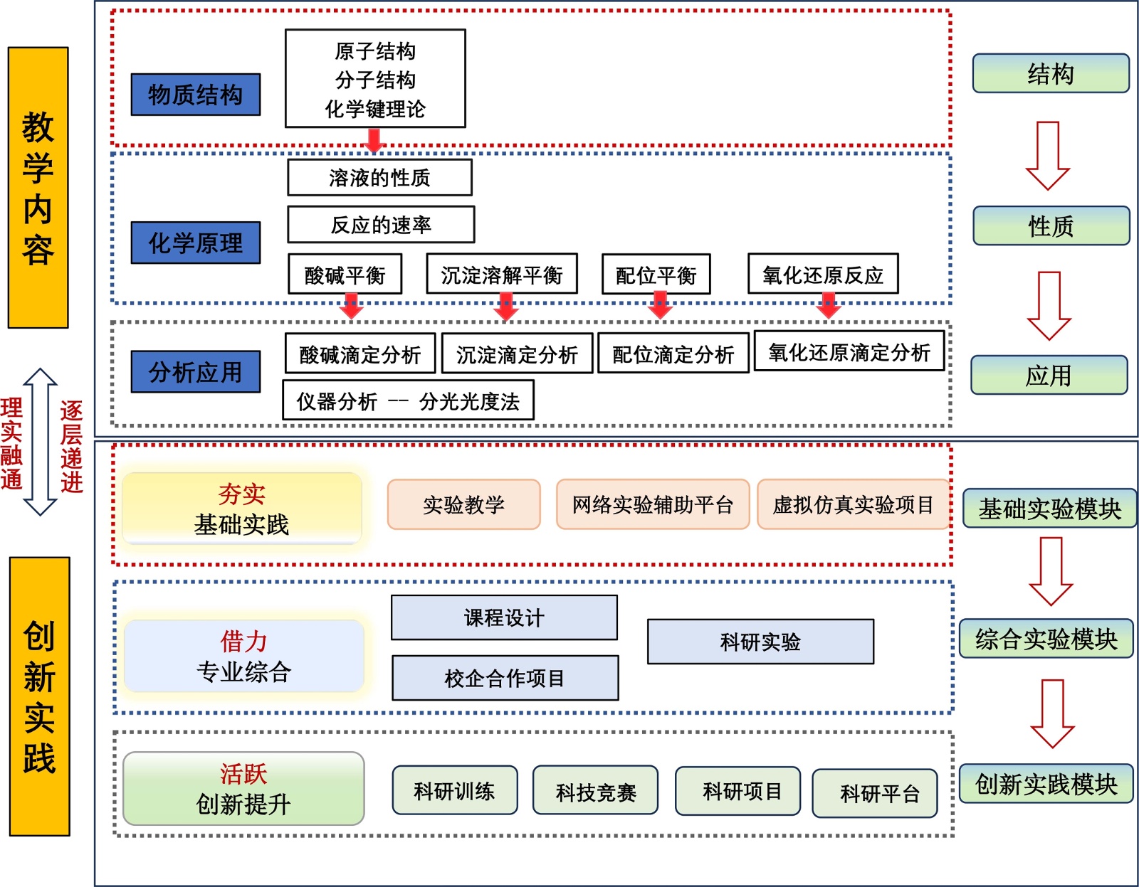 人类的思维发展与知识建构有内在的关联,建立知识体系的时候,也是思维发展的过程。因此,无机及分析化学团队将课程内容重构为3个模块,体现“结构–性质–应用”3个层次,与“知识、能力和素质”的课程目标相一致(见图3)。这样的课程内容构建,能够与学生的思维发展统一起来,使其快速建立起知识体系。与此同时,注重课堂教学与生产实际结合,将创新实践融入课程,理实融通,以激发学生的创新意识。