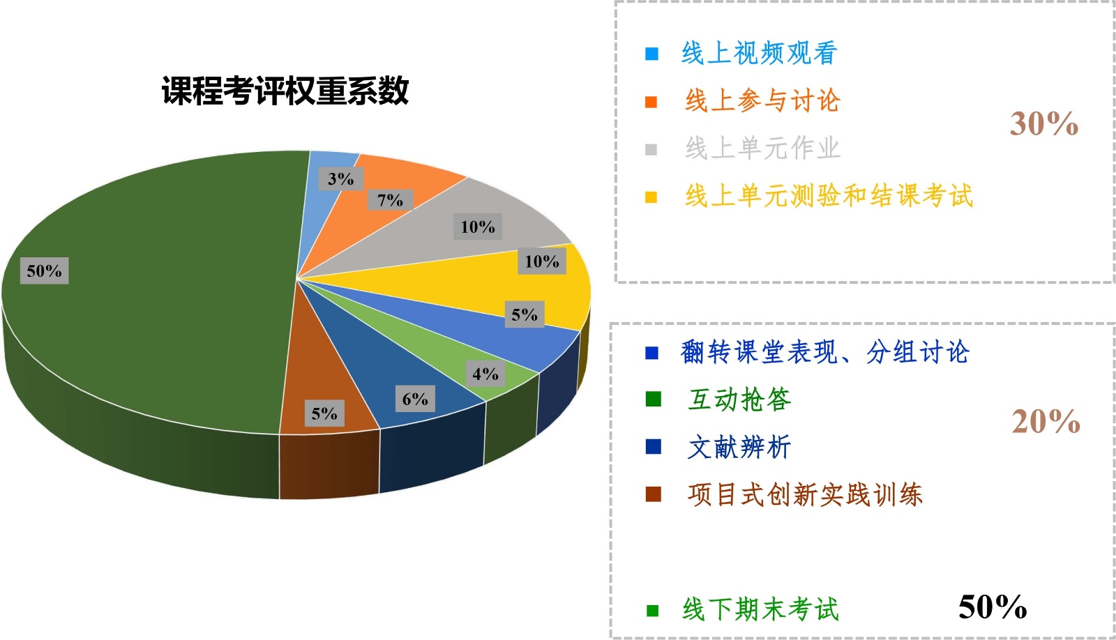 ① 课前、课中、课后全方位过程性考核评价:基于参与式互动的教学模式,引导学生由被动学习转变为主动学习,不仅使学生收获知识,而且其能力和素质也得到了锻炼和提高。为了保证学生沿着教师精心设计的教学实施路线完成本课程,考核方式必须重视过程评价,并把考核的重点放到检验学生知识、能力和素质的协调发展上。综合成绩由卷面成绩(50%)和过程性评价成绩 (50%)组成。过程评价包括:线上视频观看(3%);线上参与讨论(7%);线上单元作业(10%);线上单元测验(10%);翻转课堂表现(5%);互动抢答(4%);科学引文索引(SCI)文献辨析(6%);项目式创新实践训练成绩(5%)。过程评价量化标准如图4。