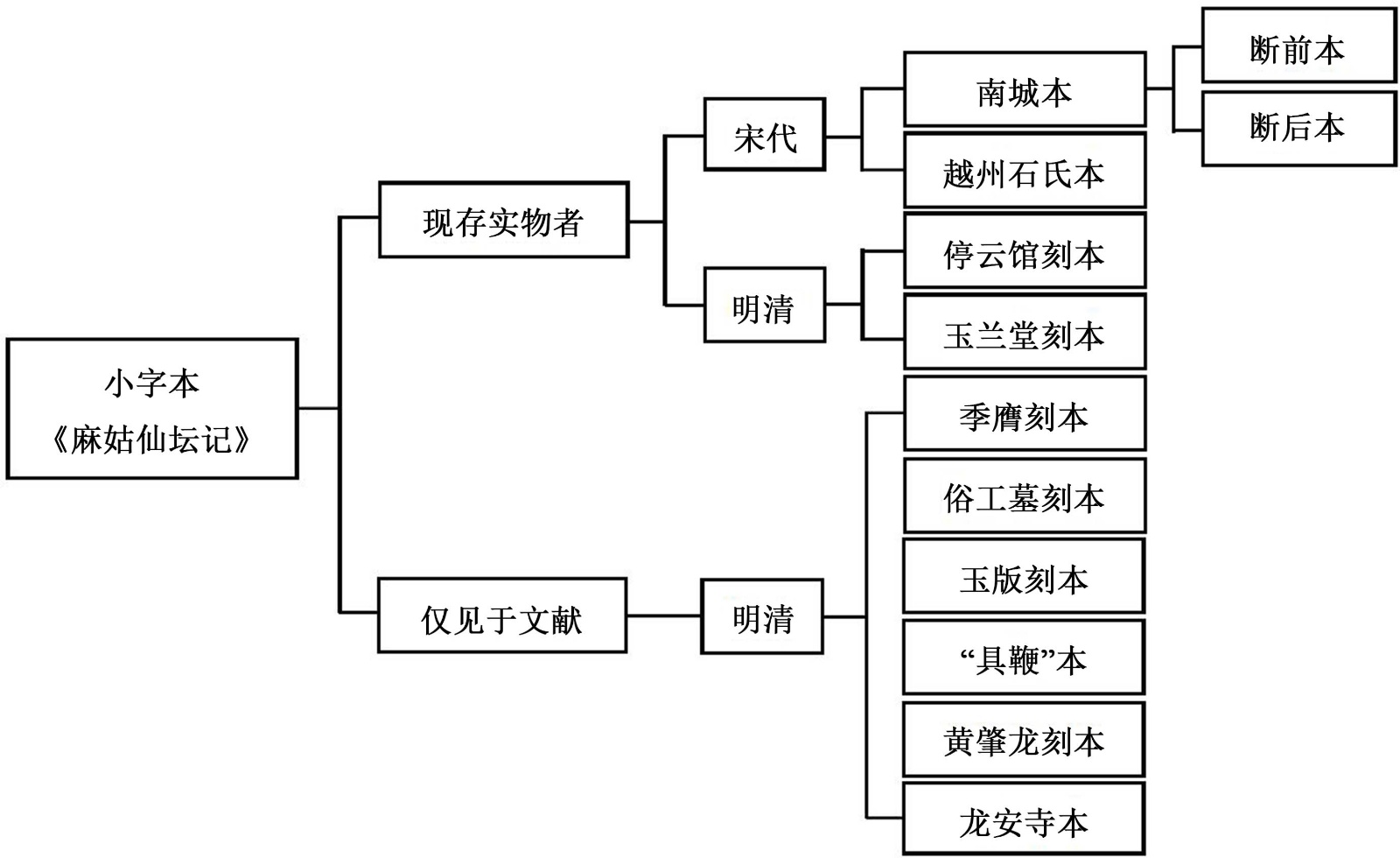历代著录中记载的小字《麻姑仙坛记》版本系统纷繁(图5),可考者主要包括南城本、越州石氏本、停云馆刻本、玉兰堂刻本、季膺刻本(章田刻本)、俗工摹刻本(藩益王重刻本)、玉版刻本、“具鞭”本、黄肇龙刻本、北京龙安寺本。依据现存状况,上述版本可划分为两类:其一为迄今仍有实物传世者,如南城本、越州石氏本、停云馆刻本、玉兰堂刻本;其二为仅见于文献记载而实物已佚者,如季膺刻本(章田刻本)、俗工摹刻本(藩益王重刻本)、玉版刻本、“具鞭”本、黄肇龙刻本、北京龙安寺本。此类失传版本虽无实物印证,但可从明清以来的题跋、方志、书论等记载中窥其摹刻源流、基本形制与艺术特征,对于全面梳理小字《麻姑仙坛记》的版本谱系与传播历程具有重要参考价值。