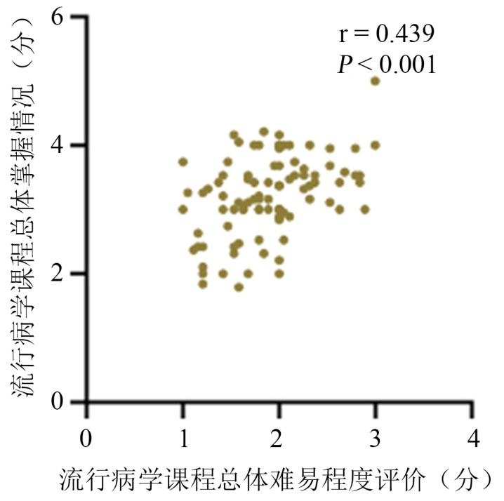 采用Pearson相关性分析方法分析流行病学课程难易程度与掌握情况的相关性,发现课程难易程度与掌握情况正相关(r = 0.439, P < 0.001),课程越容易,掌握情况越好,如图1所示。