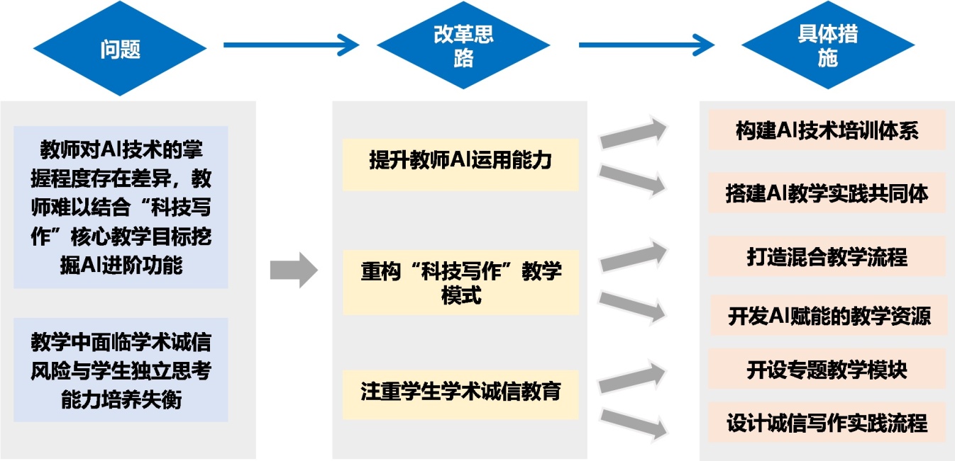 本研究采用行动研究范式,遵循“问题诊断–方案设计–实践实施–反思评估”的迭代循环,系统探索人工智能赋能“科技写作”课程的智慧教学改革路径及其成效。研究以山东建筑大学2024~2025学年“科技写作”课程为实践场景,覆盖理学院4个专业的216名本科生、研究生以及12名主讲教师。研究整体框架依据前述改革思路(见图1),围绕“教师能力建设”“教学模式重构”与“学术诚信教育”三个核心维度,设计并实施了系统的教学干预措施。
