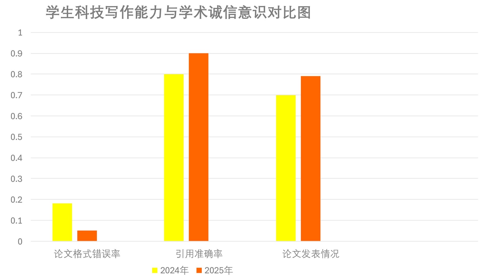 为全面客观评估改革效果,本研究采用问卷调查与文本分析相结合的方法。在课程开始前与结束后,面向全体学生发放《科技写作能力与AI使用认知调查问卷》。同时,收集所有学生在课程初期的诊断性论文(前测)与课程结束时的总结性论文(后测),采用双盲评审方式,由两位熟悉“科技写作”评价标准的教师,分别从“论文格式错误率”“引用准确性”“论文发表情况”三个维度进行独立评分与统计分析,确保评估结果的可靠性与有效性。