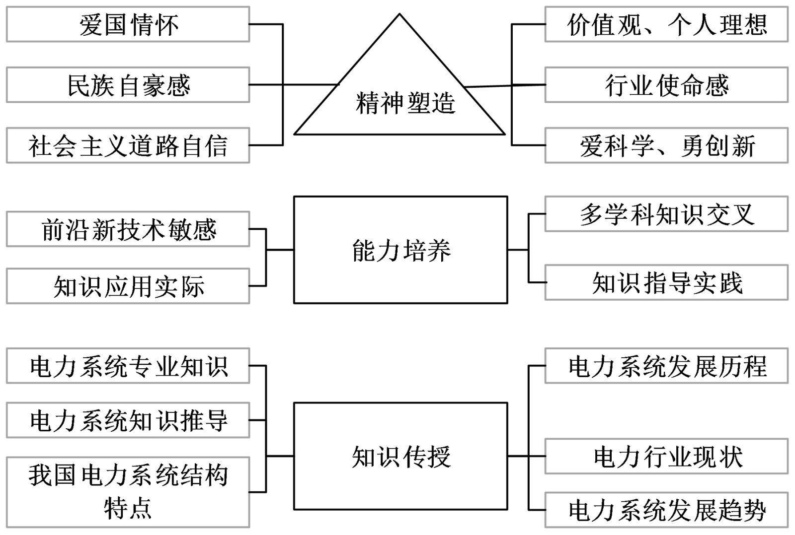 《电力系统分析》课程是电气工程及其自动化专业的一门必修课程。推进该课程的闯关式教学与思政建设,秉承“以学生为中心,以新工科为导向”的“三位一体”教育理念,知识传授、能力培养和精神塑造三者之间的关系如图1、图2所示。
