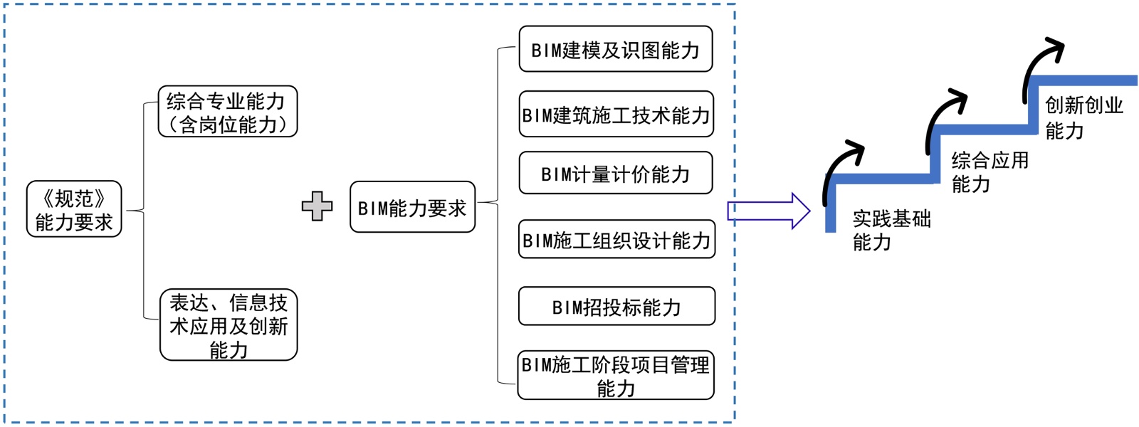 图2. 《规范》与BIM融合的三层次、阶梯式实践能力培养目标框架