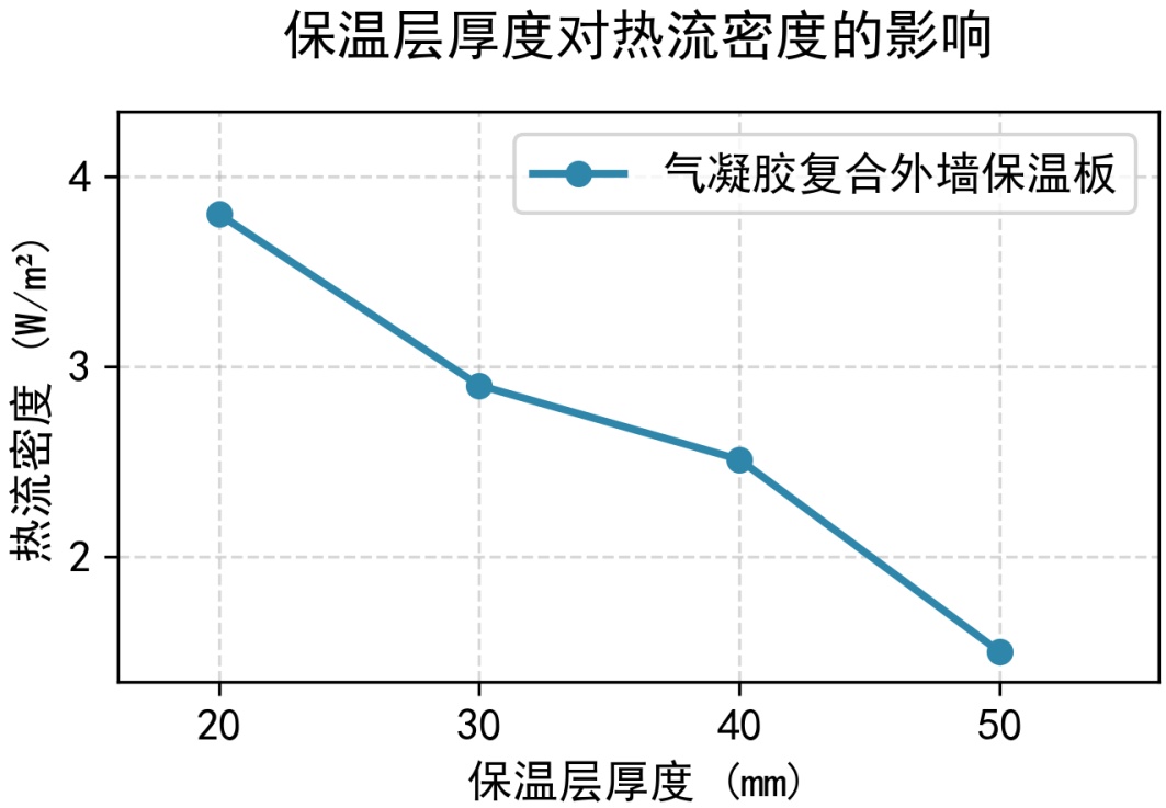 如图9所示,芯材厚度从20 mm增至50 mm,热流密度从3.8 W/m2降至1.5 W/m2,每增加10 mm热流下降23.7%,敏感性系数0.78,为最关键影响因素。因气凝胶是核心保温单元,厚度增加延长热量传递路径,显著降低热流。