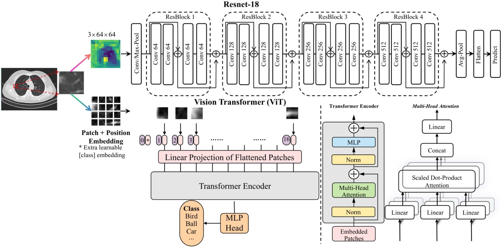 Figure 1. The image processing workflow and the architectures of the deep learning models used in this study. After manual annotation of the region of interest (ROI) on the original CT images, two processing pipelines were applied: (1) the ROI was directly fed into the convolutional neural network (ResNet-18), and (2) the ROI was divided into patches and then input into the Vision Transformer (ViT). The structures of both deep learning models are shown in the figure