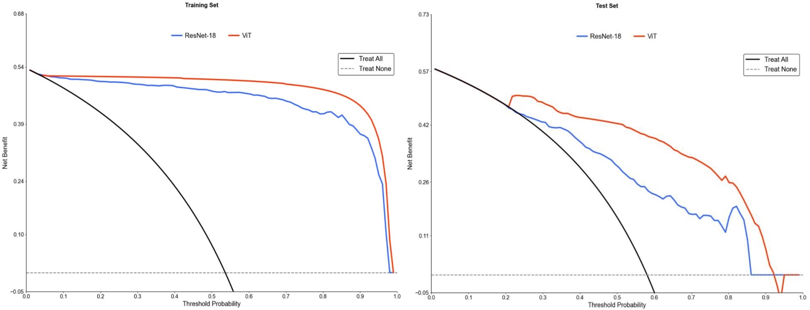 本研究基于患者术前CT影像,分别构建了ResNet-18卷积神经网络模型和Vision Transformer (ViT)模型,用于肺结节良恶性预测。结果显示,ViT模型在训练集及外部测试集均取得更高的AUC值、准确率及敏感性,表现出优于传统卷积网络的预测性能。同时,基于Grad-CAM的可视化结果显示,ViT模型能够更全面地捕捉结节的关键区域及全局上下文信息,而ResNet-18模型主要关注局部纹理特征。这一发现表明,Transformer架构在处理形态复杂或边界模糊的肺结节时具有更强的特征提取能力,能够为早期肺癌影像诊断提供更可靠的决策支持。DCA分析进一步验证了两种模型在多数阈值下的临床净效益均优于“全部治疗”或“全部不治疗”的策略,提示深度学习模型在肺结节良恶性判定中的潜在临床应用价值。